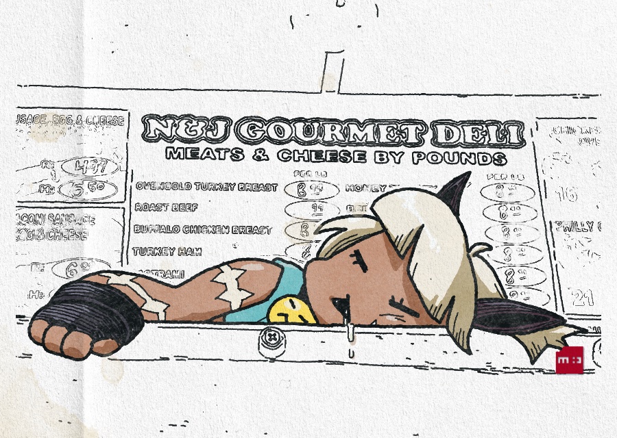 1girl :< bob_cut closed_eyes dark-skinned_female dark_skin drooling fingerless_gloves gloves menu menu_board minawa108 ms._fortune_(skullgirls) open_mouth photo-referenced scar short_hair skullgirls sleeping solo white_hair