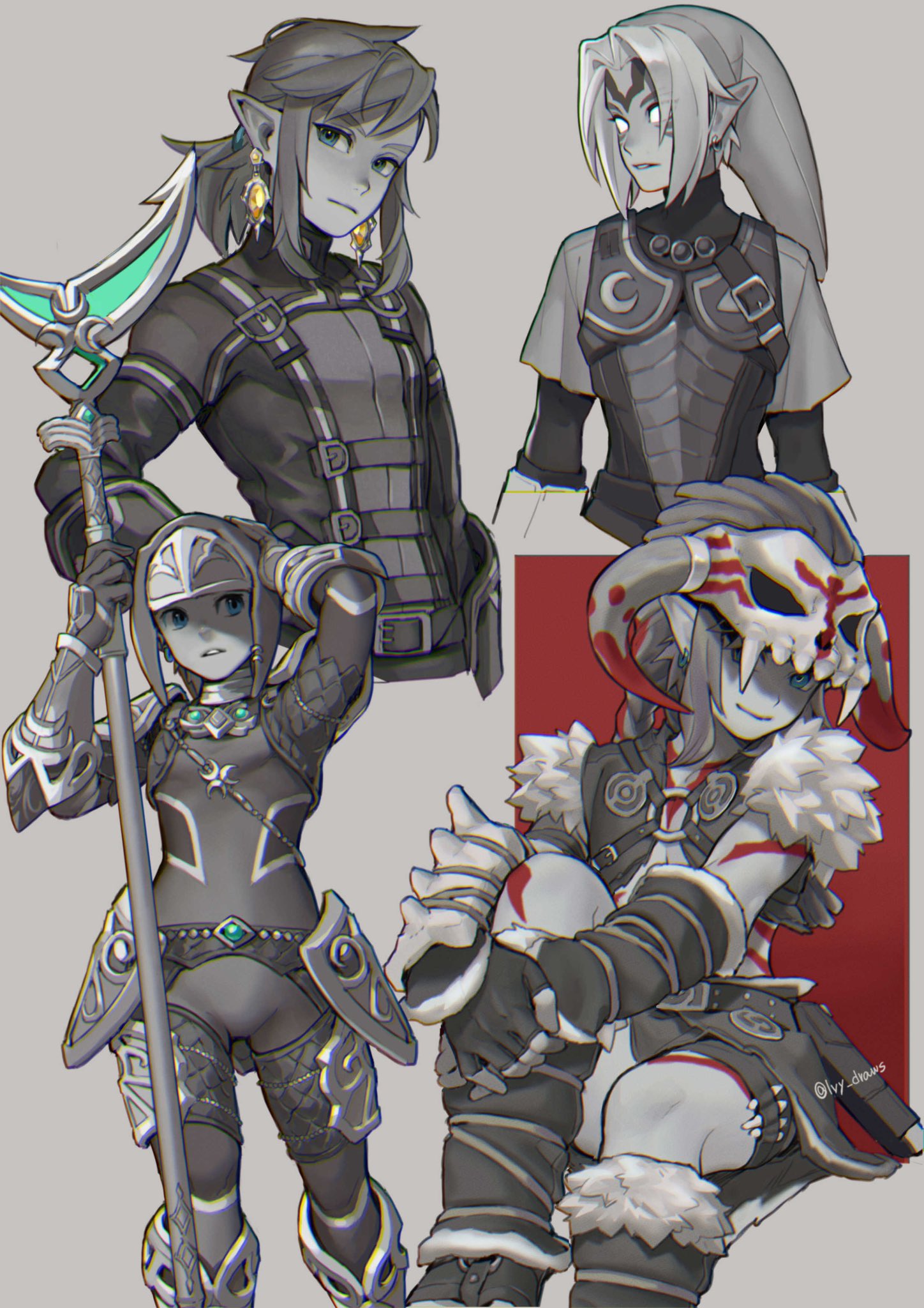1boy armor barbarian_set_(zelda) belt bodysuit boots climbing_set_(zelda) earrings feet_out_of_frame fierce_deity fingerless_gloves fur-trimmed_boots fur_trim gloves grey_background hat highres holding holding_weapon horns ivy_(sena0119) jewelry knee_boots knee_up link long_hair looking_at_viewer male_focus multiple_persona nintendo official_alternate_costume parted_bangs parted_lips pointy_ears ponytail possessed possession red_background short_sleeves sitting skull_on_head smile spot_color teeth the_legend_of_zelda the_legend_of_zelda:_breath_of_the_wild the_legend_of_zelda:_majora's_mask upper_body weapon zora_set_(zelda)