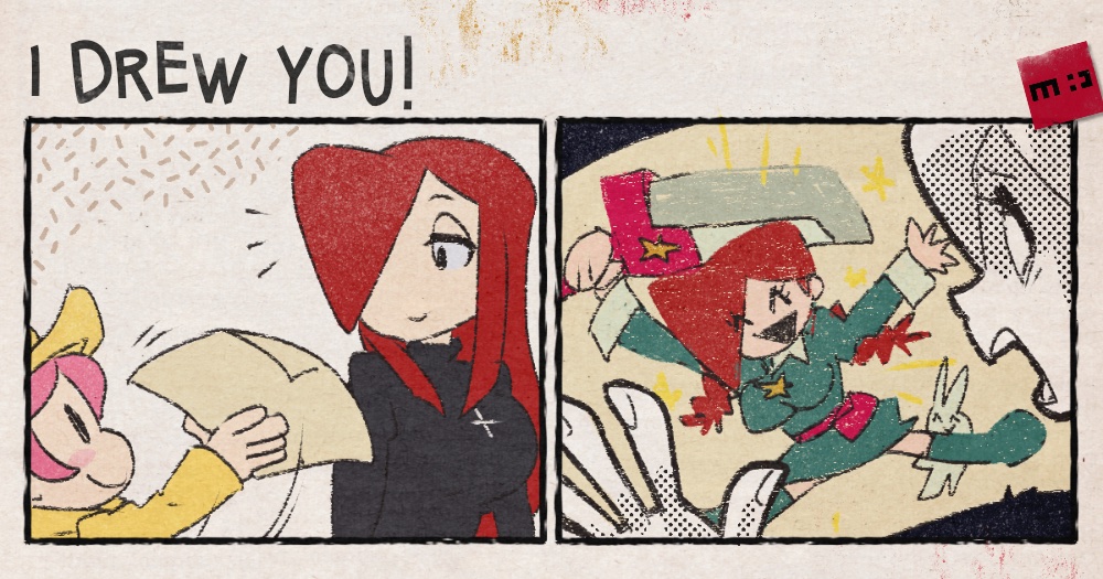 2girls 2koma ^^^ ^_^ annie_(skullgirls) annie_(skullgirls)_(cosplay) closed_eyes comic cosplay cross cross_necklace drawing hair_over_one_eye hat jewelry long_hair minawa108 multiple_girls necklace open_mouth paper parasoul_(skullgirls) pink_hair red_hair siblings sisters skullgirls sweater sword turtleneck turtleneck_sweater umbrella_(skullgirls) upper_body weapon