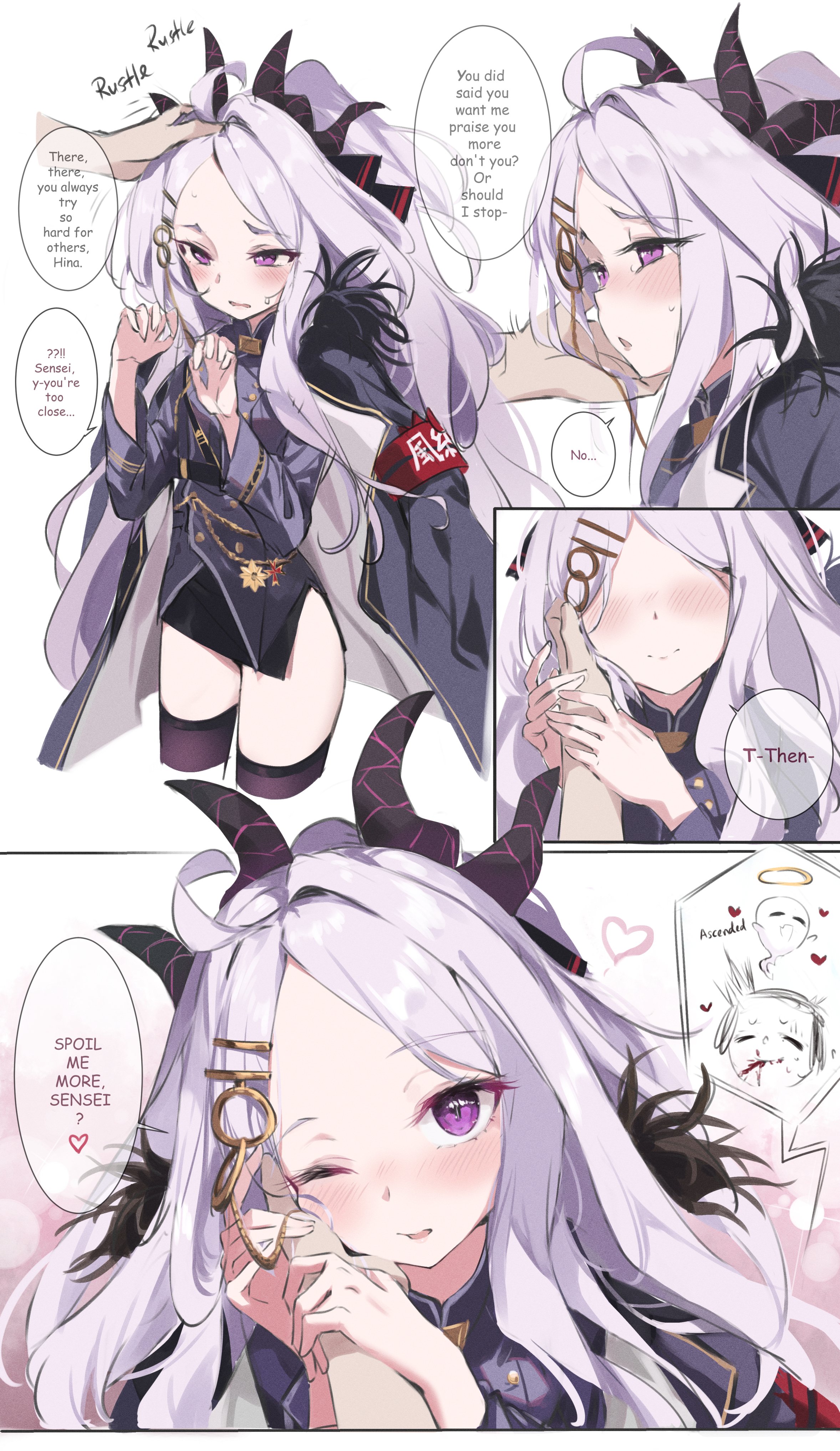 1girl absurdres ahoge black_thighhighs blue_archive blush closed_mouth coat coat_on_shoulders comic doodle_sensei_(blue_archive) english_text fur-trimmed_coat fur_trim grey_hair hair_ornament hairclip hand_on_another's_cheek hand_on_another's_face headpat heart highres hina_(blue_archive) horns long_hair long_sleeves looking_at_viewer military military_uniform multiple_horns multiple_views one_eye_closed open_mouth pov pov_hands purple_eyes sensei_(blue_archive) smile speech_bubble thighhighs timo_wei95