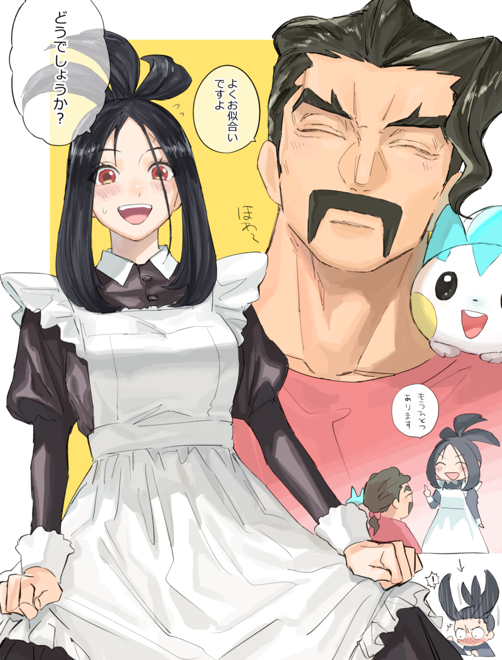 ! 1boy 1girl :d alternate_costume apron arrow_(symbol) black_hair blush buttons closed_eyes commentary_request dendra_(pokemon) enmaided eyelashes facial_hair final_fantasy final_fantasy_x flying_sweatdrops gen_4_pokemon highres long_sleeves maid meme mustache nintendo open_mouth pachirisu pink_shirt pokemon pokemon_(creature) pokemon_scarlet_and_violet saguaro_(pokemon) shirt smile speech_bubble teeth tongue translation_request umi_meteo upper_teeth_only wakka white_apron