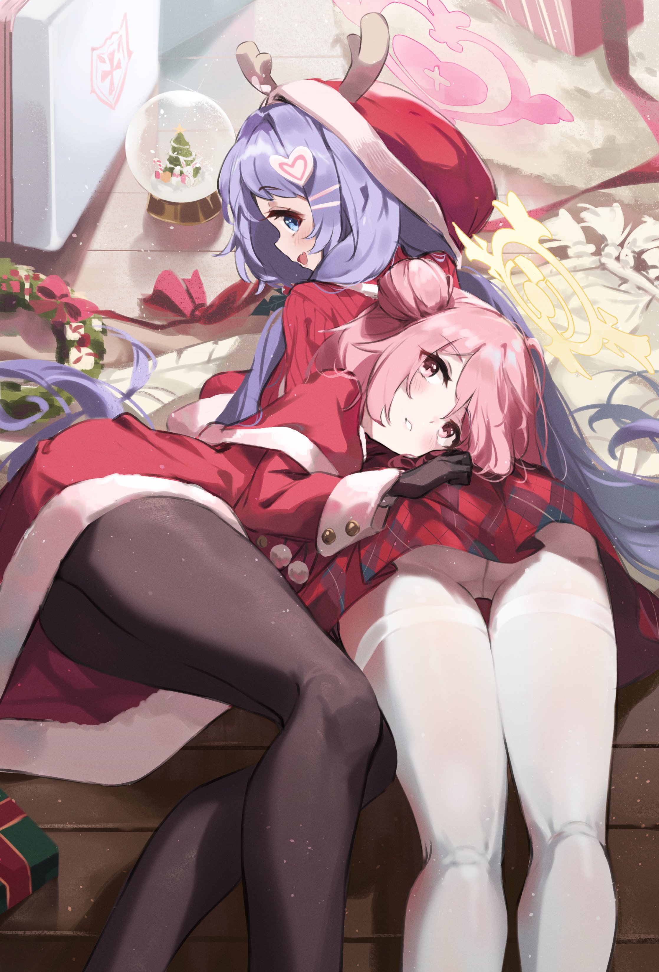 2girls absurdres ass blue_archive blue_eyes christmas dress fake_antlers hair_bun halo hanae_(blue_archive) hanae_(christmas)_(blue_archive) hat head_on_ass highres kneepits multiple_girls pantyhose pink_eyes pink_hair plaid_clothes plaid_skirt purple_hair santa_costume santa_dress santa_hat serina_(blue_archive) serina_(christmas)_(blue_archive) skirt timo_wei95 white_pantyhose