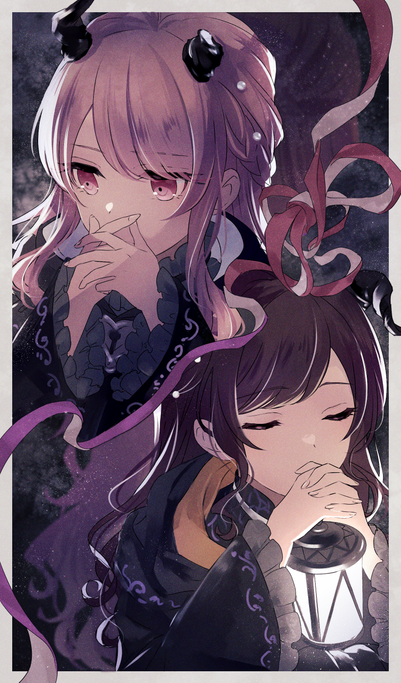 1girl 1other akiyama_mizuki asymmetrical_bangs boku_no_ashiato_kimi_no_yukusaki_(project_sekai) broken_horn brown_hair closed_eyes closed_mouth frilled_sleeves frills hands_on_own_face highres holding holding_lantern horns kumano09_(yaecha0) lantern long_hair long_sleeves lower_(vocaloid) multiple_girls pink_eyes pink_hair project_sekai ribbon shinonome_ena vocaloid