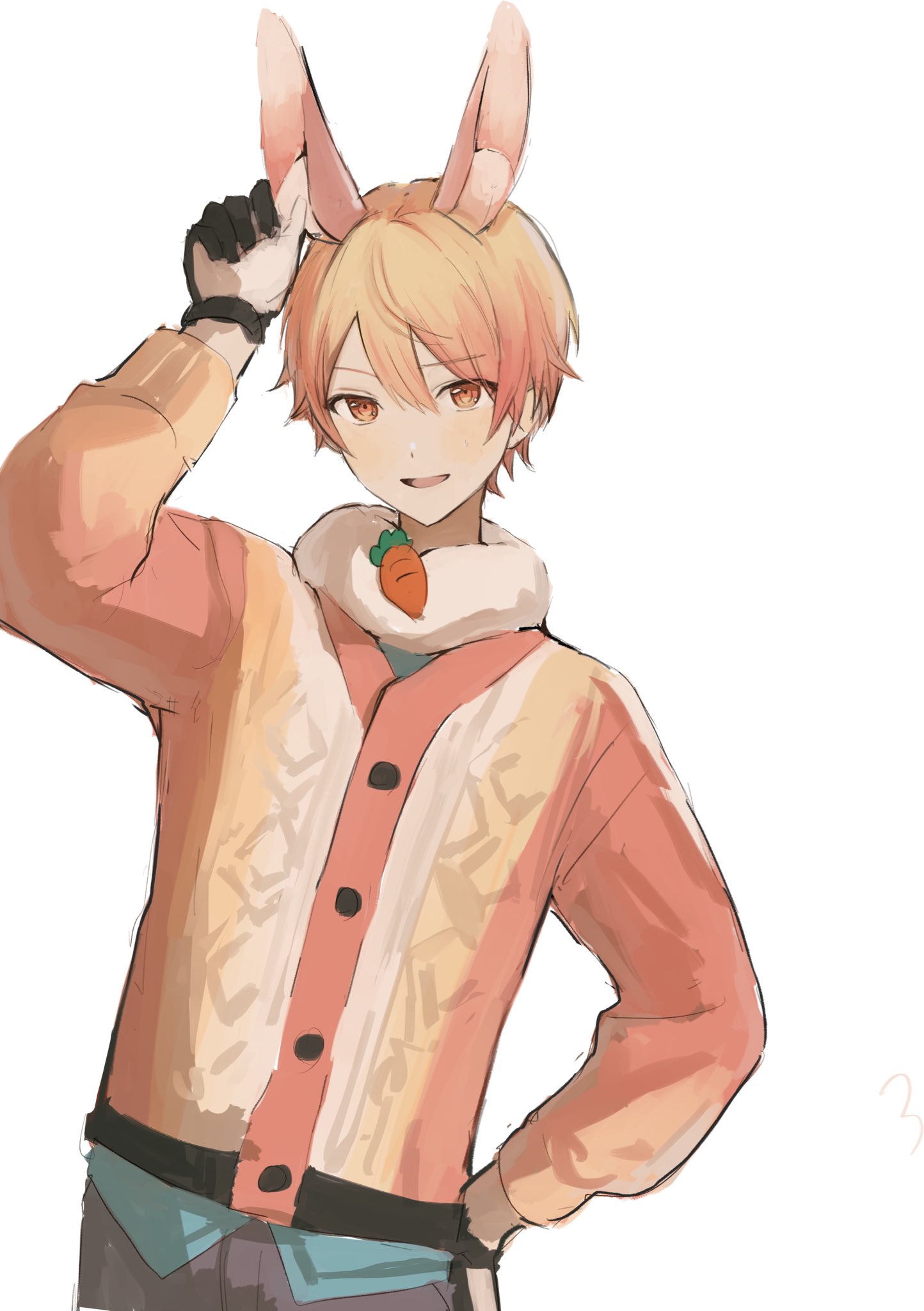 1boy animal_ear_fluff animal_ears blonde_hair buttons cardigan carrot gloves gradient_hair highres jdiujl long_sleeves multicolored_hair open_mouth orange_eyes orange_hair project_sekai rabbit_ears short_hair solo tenma_tsukasa upper_body usa_mokotto_cardigan_(project_sekai) white_background