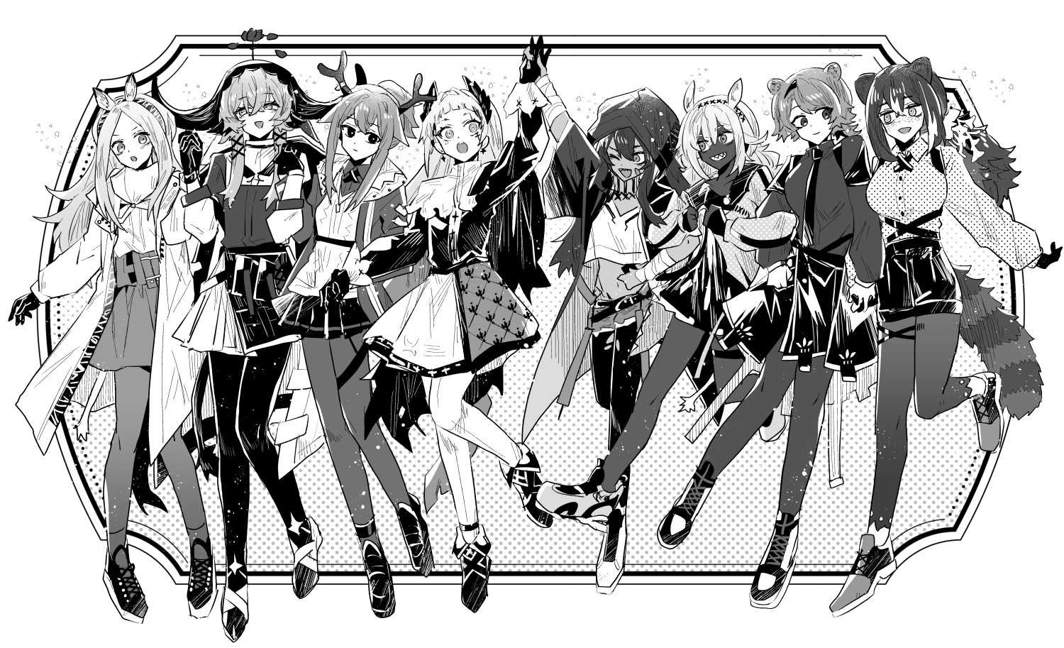 6+girls absinthe_(arknights) animal_ears antlers arknights bandages belt boots breasts closed_mouth commentary cow_horns creator_connection dress expressionless firewatch_(arknights) flint_(arknights) flower flower_on_head forehead gloves greyscale head_wings heavyrain_(arknights) hood hood_up horns irene_(arknights) iwashi_80 large_breasts loafers low_ponytail miniskirt monochrome multiple_girls necktie one_eye_closed open_mouth pallas_(arknights) pantyhose ponytail raccoon_ears raccoon_tail robin_(arknights) shoes short_bangs shorts skirt untranslatable_commentary tail tuye_(arknights) wings zebra_ears