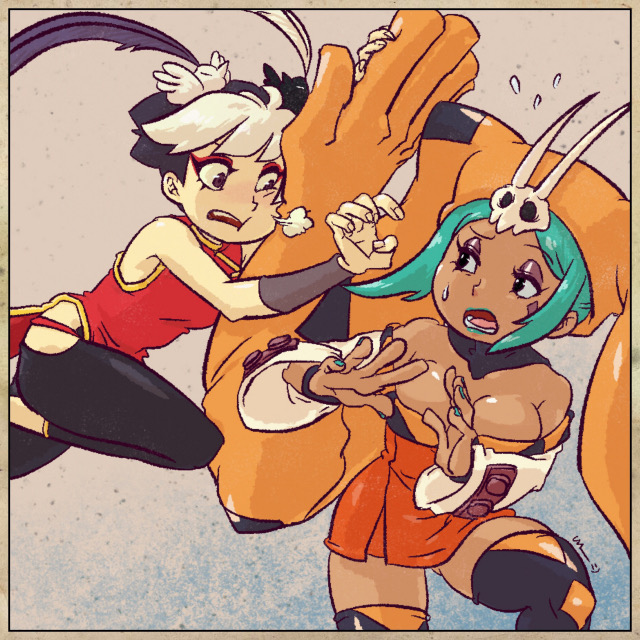 2girls angry bird black_hair boots breath cerebella_(skullgirls) chinese_clothes dark-skinned_female dark_skin detached_collar eyeshadow feng_(skullgirls) green_hair green_lips green_nails jumping looking_at_another makeup minawa108 multicolored_hair multiple_girls open_mouth purple_eyes short_hair skirt skullgirls sweat sweatdrop tackle thigh_boots two-tone_hair vice-versa_(skullgirls) white_hair