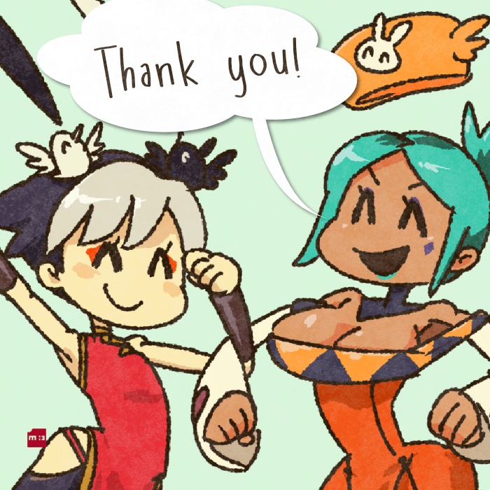 2girls ^_^ black_hair blush_stickers cerebella_(skullgirls) chinese_clothes closed_eyes dark-skinned_female dark_skin detached_collar feng_(skullgirls) green_background green_hair locked_arms makeup mascara minawa108 multicolored_hair multiple_girls ponytail short_hair skullgirls thank_you two-tone_hair vambraces vice-versa_(skullgirls) white_hair