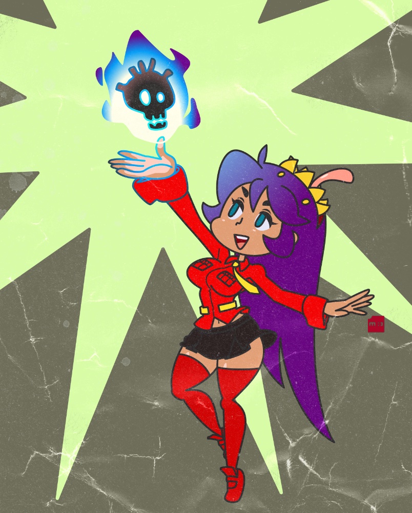 1girl alternate_color blue_eyes dark-skinned_female dark_skin filia_(skullgirls) full_body green_background long_hair minawa108 navel necktie open_mouth pleated_skirt purple_hair school_uniform skirt skull_heart skullgirls smile solo thighhighs