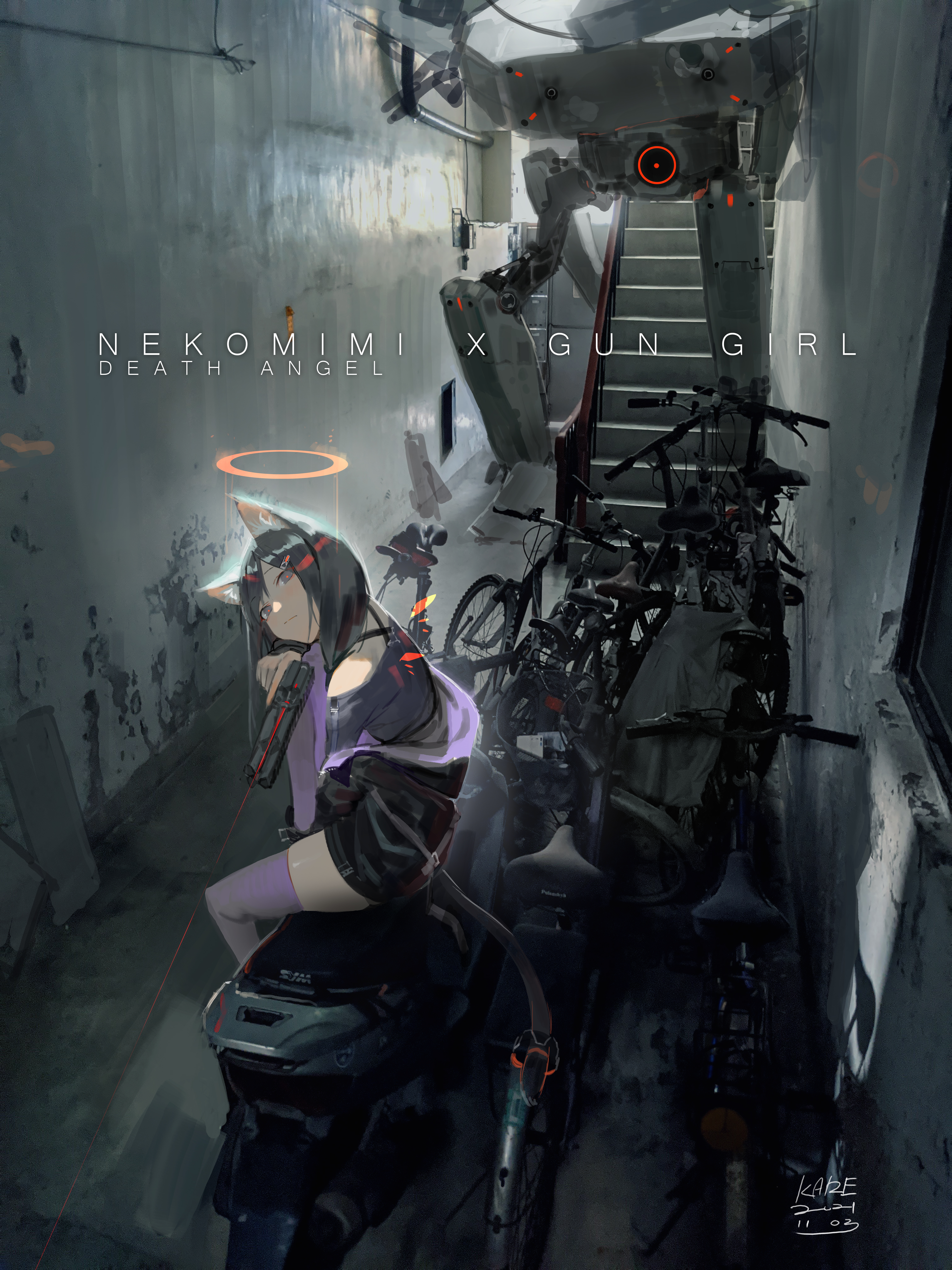 1girl absurdres animal_ear_fluff animal_ears bicycle black_eyes black_footwear black_hair black_jacket black_shirt cat_ears cat_girl cat_tail closed_mouth commentary dated dated_commentary detached_wings energy_wings english_commentary english_text gun hair_ornament hairclip halo handgun highres holding holding_gun holding_weapon jacket jacket_partially_removed kare_huang laser laser_pointer_projection laser_sight long_sleeves looking_at_viewer medium_hair motor_vehicle motorcycle original outdoors purple_thighhighs red_pupils robot shirt signature sitting solo swept_bangs tail thighhighs weapon wings