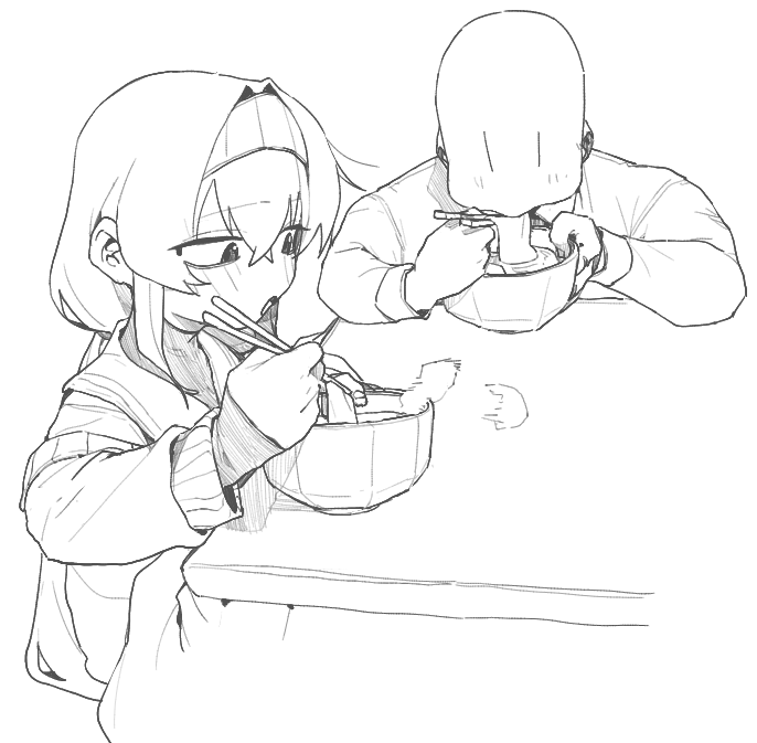 1boy 1girl bags_under_eyes bald blue_archive bowl cardigan chopsticks eating greyscale hair_between_eyes hairband holding holding_chopsticks kotatsu long_hair long_sleeves monochrome off_shoulder open_mouth rkgk_ojisan shirt table ui_(blue_archive) under_kotatsu under_table