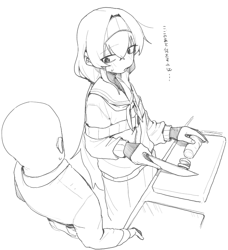 1boy 1girl bags_under_eyes bald blue_archive cardigan cutting_board greyscale hair_between_eyes hairband holding holding_knife knife long_hair long_sleeves looking_at_viewer monochrome neckerchief off_shoulder rkgk_ojisan shirt skirt translation_request ui_(blue_archive)