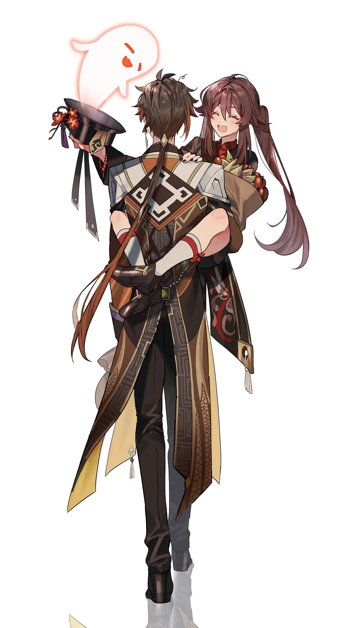 1boy 1girl :d ^_^ antenna_hair bead_bracelet beads black_headwear black_nails black_ribbon black_shorts blush boo_tao_(genshin_impact) bracelet brown_footwear brown_hair brown_jacket brown_pants carrying chinese_clothes closed_eyes coattails commentary_request earrings eyelashes facing_away fang fingernails flower full_body genshin_impact ghost gradient_hair gurugnsn hair_between_eyes hair_ornament happy hat hat_flower hat_ribbon highres hu_tao_(genshin_impact) jacket jewelry long_hair long_sleeves low_ponytail multicolored_hair nail_polish open_mouth orange_hair pants ponytail porkpie_hat red_flower red_shirt ribbon shirt shoes short_shorts shorts sidelocks simple_background single_earring skin_fang smile socks standing tailcoat tassel tassel_earrings twintails unworn_hat unworn_headwear very_long_hair white_background white_socks wide_sleeves zhongli_(genshin_impact)
