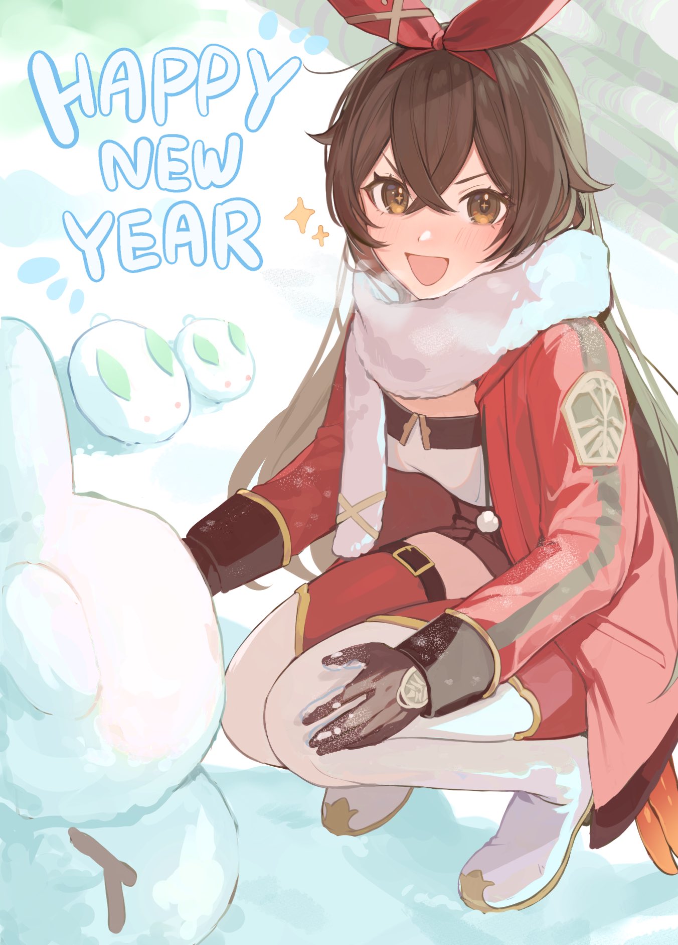 1girl amber_(genshin_impact) arisuke_(natuyan) boots breasts breath brown_eyes brown_gloves brown_hair brown_shorts coat commentary crossed_bangs english_text genshin_impact gloves happy_new_year highres long_hair looking_at_viewer new_year open_mouth red_coat red_ribbon ribbon scarf shorts small_breasts smile snow snow_rabbit snowman solo sparkle sparkling_eyes squatting thigh_boots v-shaped_eyebrows white_boots white_scarf winter