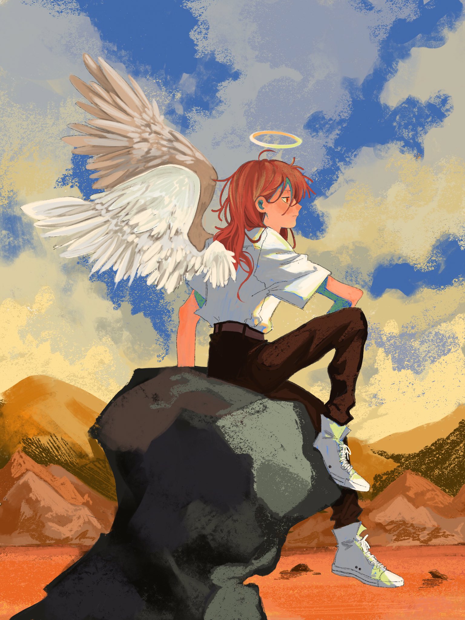 1boy angel_devil_(chainsaw_man) angel_wings blue_sky chainsaw_man cloud collared_shirt cosplay desert halo highres long_hair looking_afar makosh_(nemakoshh) mechanical_halo nagisa_kaworu nagisa_kaworu_(cosplay) neon_genesis_evangelion red_hair scene_reference shirt shirt_tucked_in sitting sky solo white_footwear white_shirt white_wings wings
