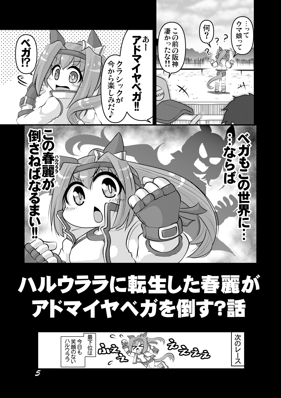>_< +++ 1girl admire_vega_(umamusume) animal_ears baseball_cap bow clenched_hands comic comiket_101 ear_bow ear_covers fingerless_gloves flying_sweatdrops gloves grass greyscale hair_bow hair_intakes haru_urara_(bestest_prize)_(umamusume) haru_urara_(umamusume) hat headband high_ponytail highres horse_ears horse_girl horse_racing_track jacket low_ponytail monochrome motion_lines on_ground page_number people polka_dot polka_dot_background ponytail reincarnation silhouette speech_bubble street_fighter sugitani_kouji track_jacket translation_request turning_head umamusume upper_body v-shaped_eyes