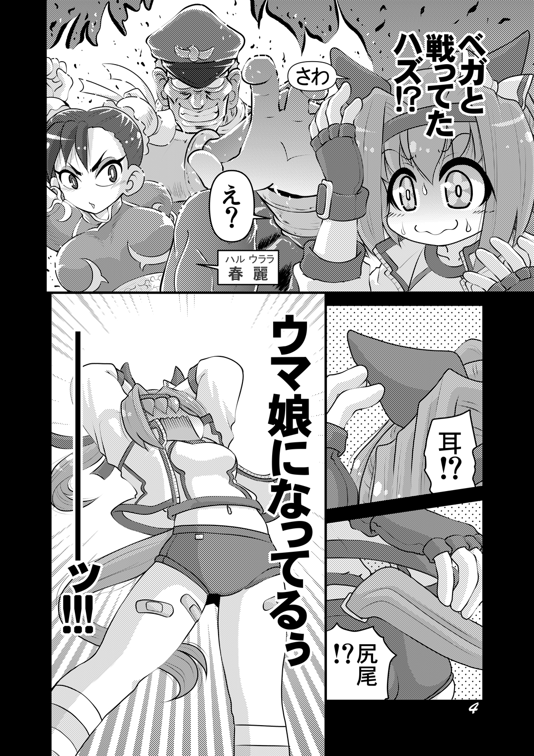 1girl alternate_kanji_reading animal_ears aura bandaid_on_thigh bow buruma capcom chinese_clothes chun-li collarbone comic comiket_101 double_bun ear_bow ear_covers emphasis_lines fingerless_gloves flashback furigana gloves greyscale grin hair_between_eyes hair_bun hair_intakes hand_on_own_ear haru_urara_(bestest_prize)_(umamusume) haru_urara_(umamusume) hat headband high_ponytail highres horse_ears horse_girl horse_tail jacket kneehighs long_hair long_sleeves m._bison midriff_peek monochrome navel page_number peaked_cap polka_dot polka_dot_background ponytail puffy_short_sleeves puffy_sleeves reincarnation short_sleeves smile socks speech_bubble street_fighter sugitani_kouji sweatdrop tail track_jacket translation_request umamusume v-shaped_eyebrows