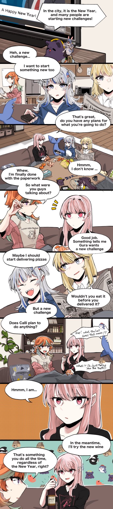6+girls animal_ears bloop_(gawr_gura) blue_eyes blue_hair bookshelf bottle bubba_(watson_amelia) comic death-sensei_(mori_calliope) english_text fins fish_tail flat_screen_tv gawr_gura grey_hair highres hololive hololive_english long_hair long_image mori_calliope multicolored_hair multiple_girls newspaper ninomae_ina'nis orange_hair pink_hair rabbit_ears rabbit_girl shark_tail streaked_hair sukebeningn tail takanashi_kiara takodachi_(ninomae_ina'nis) tall_image television usada_pekora usada_pekora_(1st_costume) virtual_youtuber watson_amelia wine_bottle
