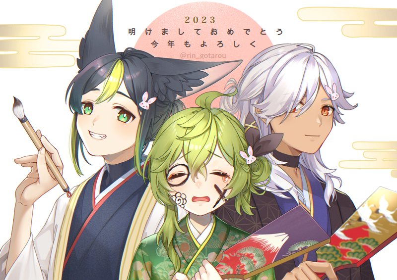 1girl 2023 2boys animal_ears black_hair closed_eyes collei_(genshin_impact) cyno_(genshin_impact) fox_ears genshin_impact green_hair hair_between_eyes hair_ornament japanese_clothes kimono long_sleeves multicolored_hair multiple_boys paintbrush rabbit_hair_ornament rin_gotarou smile tighnari_(genshin_impact) two-tone_hair white_hair yukata