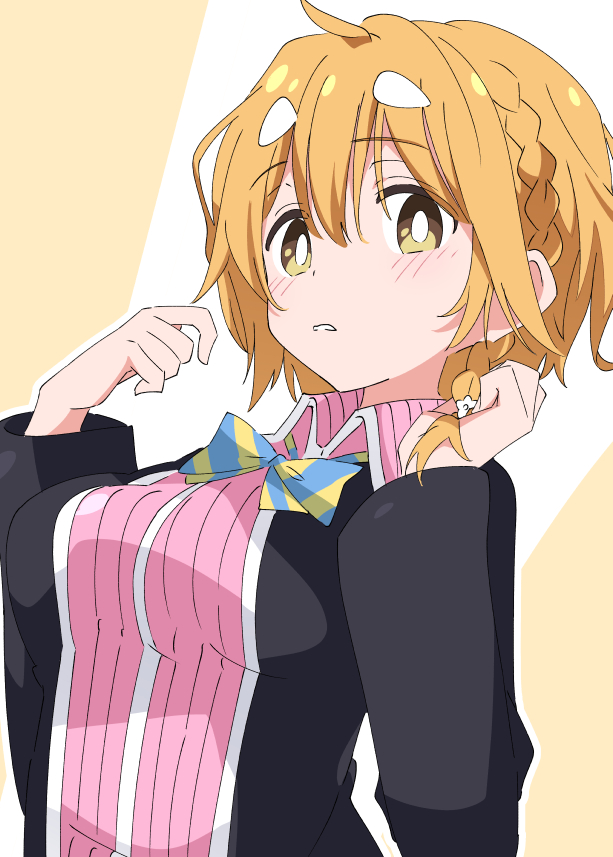 1girl black_jacket bow bowtie braid ixy jacket koiwai_yoshino looking_at_viewer masamune-kun_no_revenge orange_hair pink_shirt shirt short_hair single_braid solo upper_body yellow_eyes