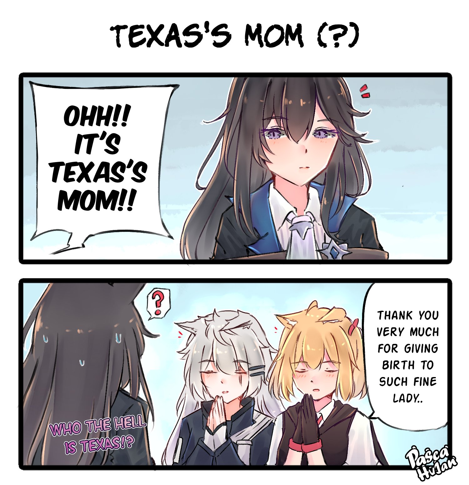 2koma 3girls ? arknights black_gloves black_hair black_jacket black_vest blonde_hair blush closed_eyes collared_shirt comic commentary_request english_text fingerless_gloves gertrude_strollo_(arknights) gloves grey_hair hair_between_eyes hair_ornament hairclip highres jacket lappland_(arknights) long_hair multiple_girls notice_lines palms_together parted_lips pascahujan praying purple_eyes scar scar_across_eye scar_on_face shirt sora_(arknights) spoken_question_mark vest white_gloves white_shirt