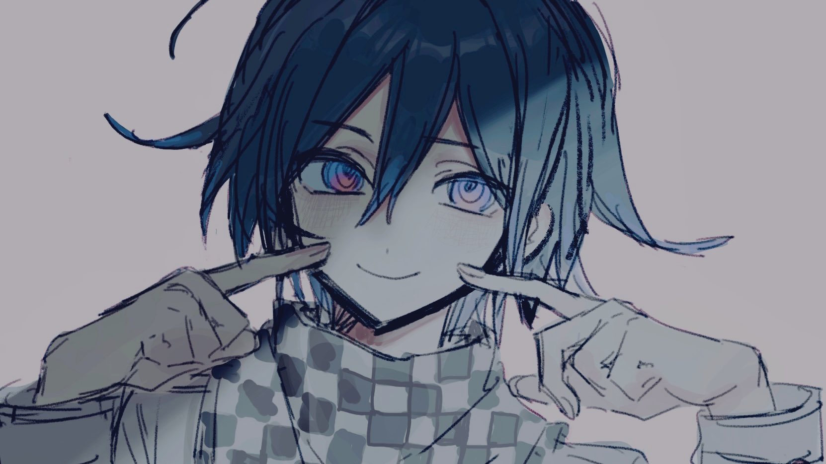 1boy black_hair checkered_clothes checkered_scarf danganronpa_(series) danganronpa_v3:_killing_harmony grey_background hair_between_eyes hands_up highres long_sleeves looking_at_viewer male_focus oma_kokichi portrait protected_link purple_hair scarf simple_background sketch smile solo ze_ro_saiji