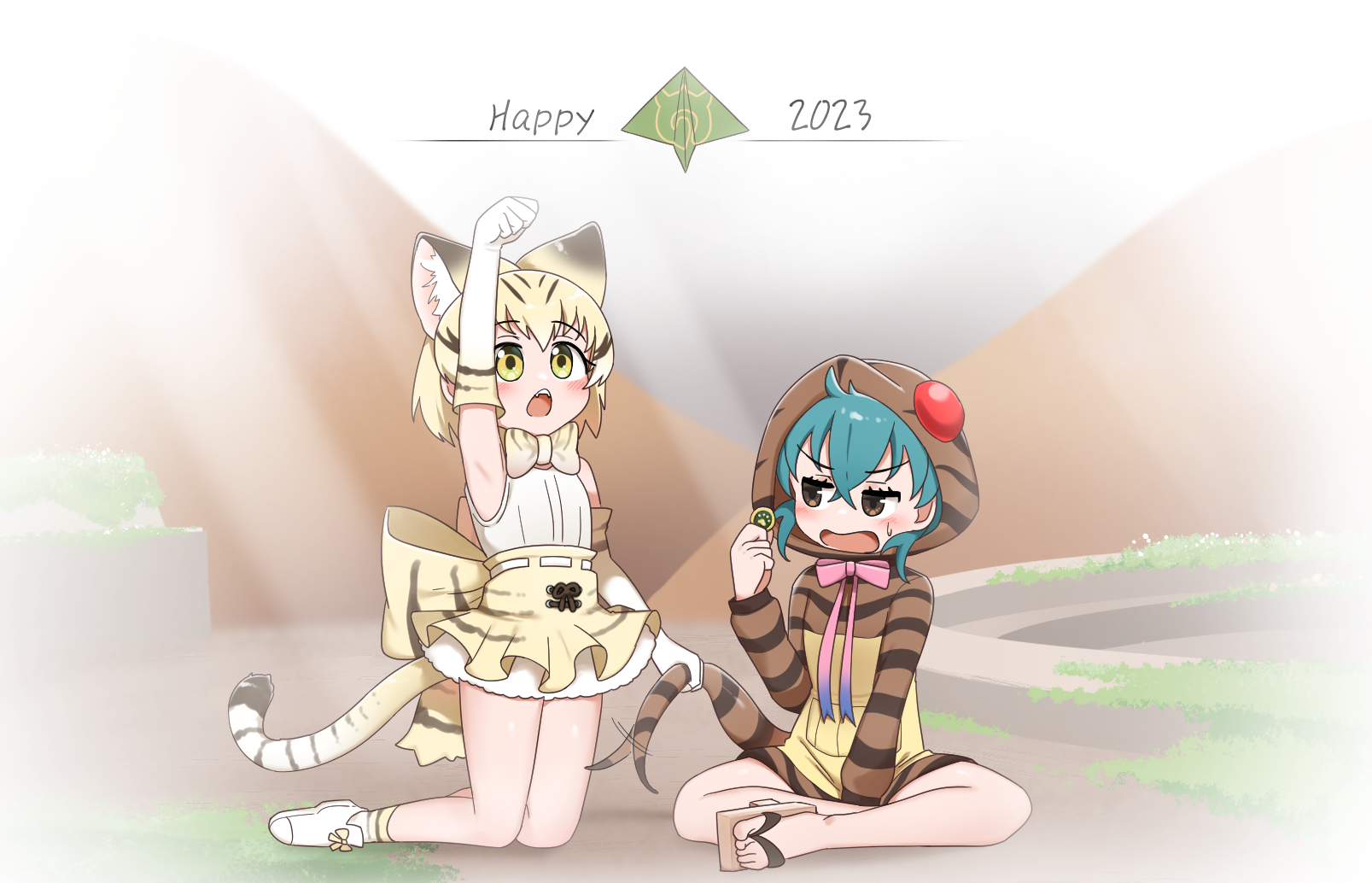 2023 2girls afterimage animal_ears back_bow blonde_hair bow bowtie brown_eyes brown_hoodie cat_ears cat_tail chis_(js60216) commentary english_commentary english_text extra_ears fang frown gradient_ribbon green_hair happy_new_year high-waist_skirt highres holding hood hood_up hoodie indian_style japari_symbol kemono_friends kneeling long_sleeves looking_at_another looking_up miniskirt motion_lines multiple_girls new_year open_mouth paw_pose petticoat ribbon sand_cat_(kemono_friends) sandals shirt shoes short_hair sitting skirt sleeveless sleeveless_shirt snake_hood snake_tail socks striped_tail sweatdrop tail tail_grab tsuchinoko_(kemono_friends) white_footwear white_shirt yellow_bow yellow_bowtie yellow_eyes yellow_skirt yellow_socks