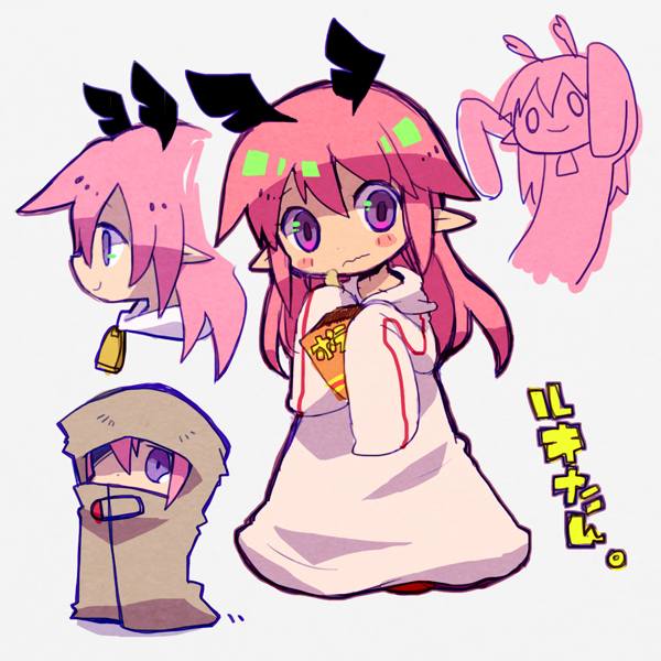 1girl 73_(naa) blush child chips_(food) food holding long_sleeves looking_at_viewer looking_away medium_hair pink_hair pointy_ears potato_chips purple_eyes ruki_(senyuu) sen'yuu. simple_background sleeves_past_fingers sleeves_past_wrists white_background