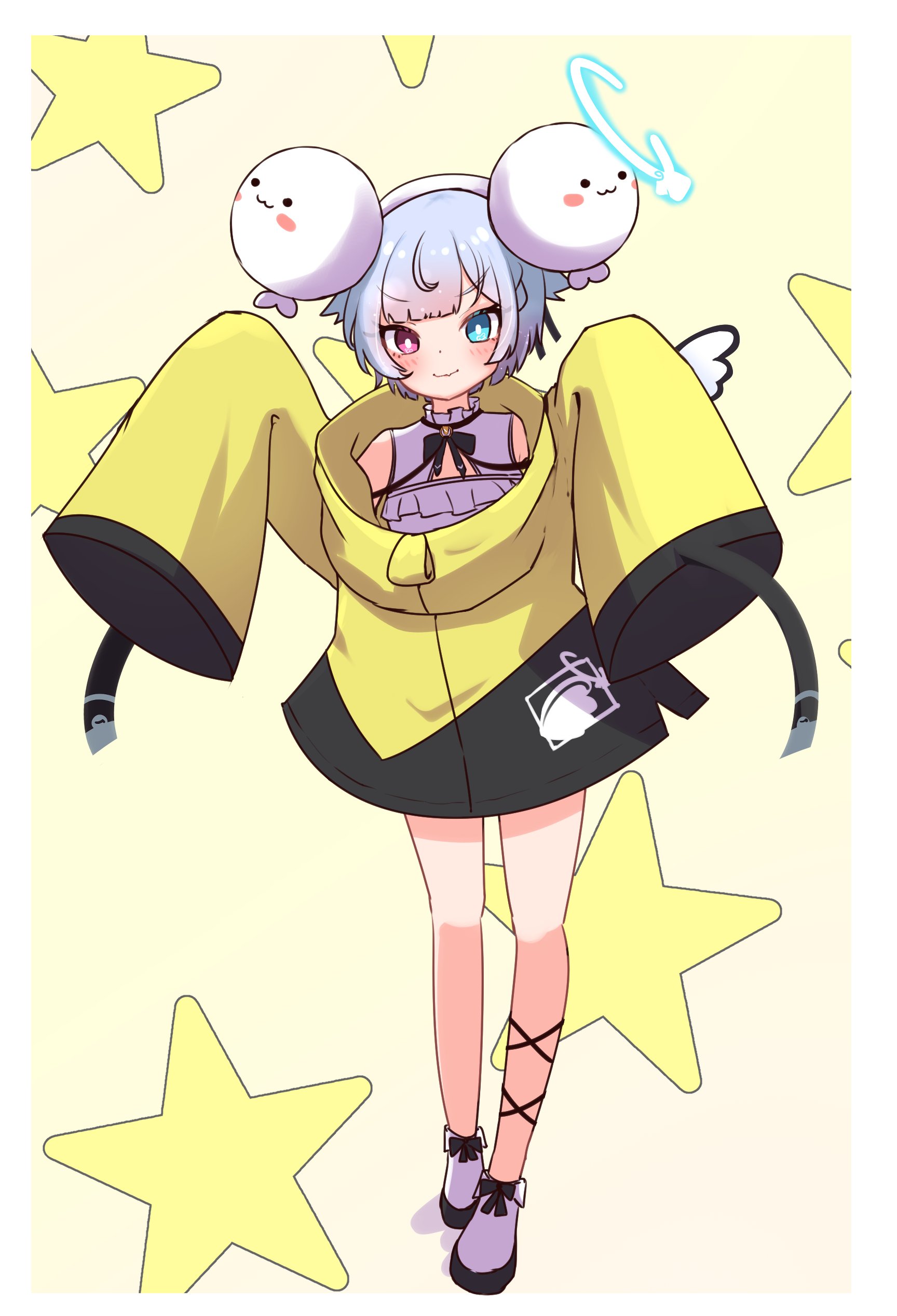 1girl absurdres amemiya_nazuna angel angel_wings ankle_socks blue_eyes border chibi cosplay fang frilled_shirt frills hair_bobbles hair_ornament heterochromia highres iono_(pokemon) iono_(pokemon)_(cosplay) leg_ribbon long_sleeves looking_at_viewer milk_tea_1993 nintendo oversized_clothes pokemon pokemon_scarlet_and_violet red_eyes ribbon shirt short_hair sidelocks simple_background single_wing skin_fang socks star_(symbol) star_symbol_background very_long_sleeves virtual_youtuber vshojo white_border white_shirt wings yellow_background