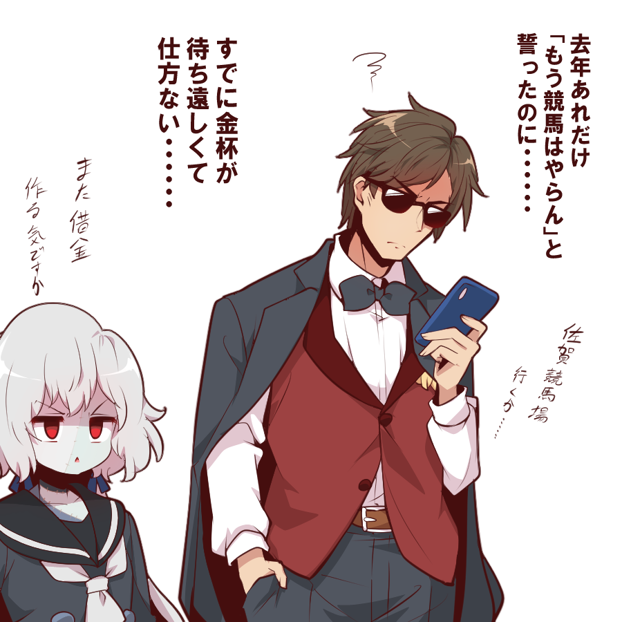 1boy 1girl belt black_pants blue_ribbon brown_hair cellphone dress empty_eyes hair_ribbon hand_in_pocket holding holding_phone jacket jacket_on_shoulders konno_junko long_hair long_sleeves low_twintails necktie pants patchwork_skin phone red_eyes red_vest ribbon sailor_dress simple_background smartphone sunglasses tatsumi_koutarou translated twintails vest white_background white_hair white_necktie yonedatomo_mizu zombie zombie_land_saga