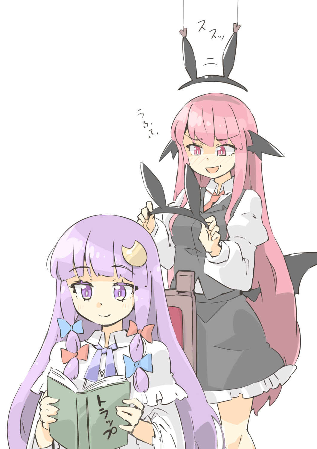 2girls :d animal_ears arnest black_hairband black_skirt black_vest black_wings blue_bow blue_ribbon blunt_bangs blush book bow bright_pupils capelet chair closed_mouth collared_capelet collared_shirt colored_eyelashes crescent crescent_hair_ornament demon_wings dot_nose evil_smile eyes_visible_through_hair fake_animal_ears feet_out_of_frame frilled_capelet frilled_sleeves frills furrowed_brow giggling hair_bow hair_ornament hair_ribbon hairband hands_up head_wings highres holding holding_book holding_hairband koakuma long_hair long_sleeves looking_ahead looking_at_another low_wings mini_wings motion_lines multiple_girls multiple_wings narrowed_eyes neck_ribbon necktie missing_headwear on_chair open_book open_mouth patchouli_knowledge petticoat prank puffy_long_sleeves puffy_sleeves purple_eyes purple_hair rabbit_ears reading red_bow red_hair red_necktie ribbon shirt simple_background skirt skirt_set smile sound_effects split_mouth standing touhou translated tress_ribbon upper_body v-shaped_eyebrows very_long_hair vest w_arms white_background white_capelet white_pupils white_shirt white_sleeves wide_sleeves wing_collar wings