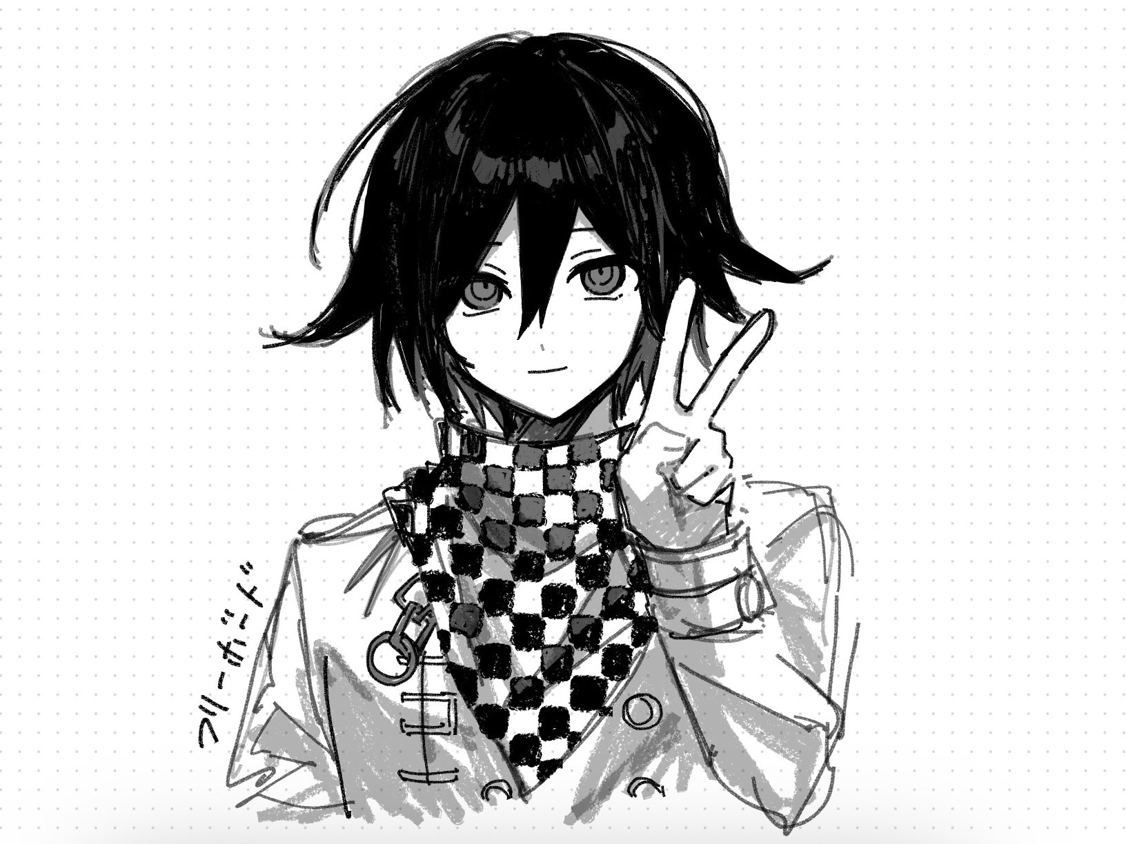 1boy buttons checkered_clothes checkered_scarf closed_mouth danganronpa_(series) danganronpa_v3:_killing_harmony flipped_hair hair_between_eyes hand_up highres jacket long_sleeves looking_at_viewer oma_kokichi protected_link scarf short_hair sketch smile solo translation_request upper_body v ze_ro_saiji