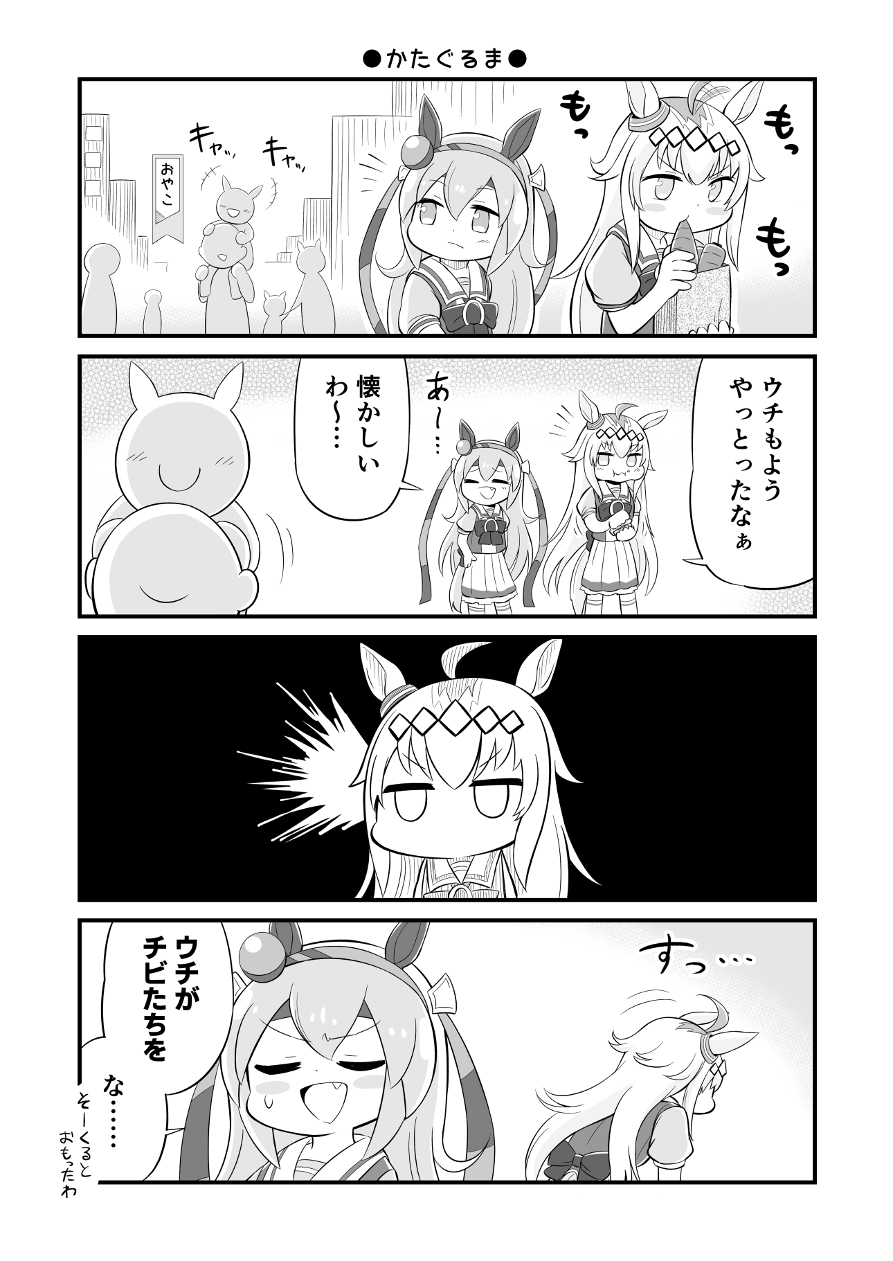 +++ 2girls 4koma 6+others :d ahoge animal_ears bag blush bow carrot carrying closed_eyes closed_mouth comic faceless fang food fuyake_taiyaki greyscale hair_between_eyes hairband highres holding holding_bag holding_food horse_ears horse_girl horse_tail long_hair monochrome multicolored_hair multiple_girls multiple_others oguri_cap_(umamusume) open_mouth paper_bag people piggyback pleated_skirt puffy_short_sleeves puffy_sleeves school_uniform shirt short_sleeves silhouette skirt smile sweat tail tamamo_cross_(umamusume) tracen_school_uniform translation_request two-tone_hair umamusume v-shaped_eyebrows very_long_hair