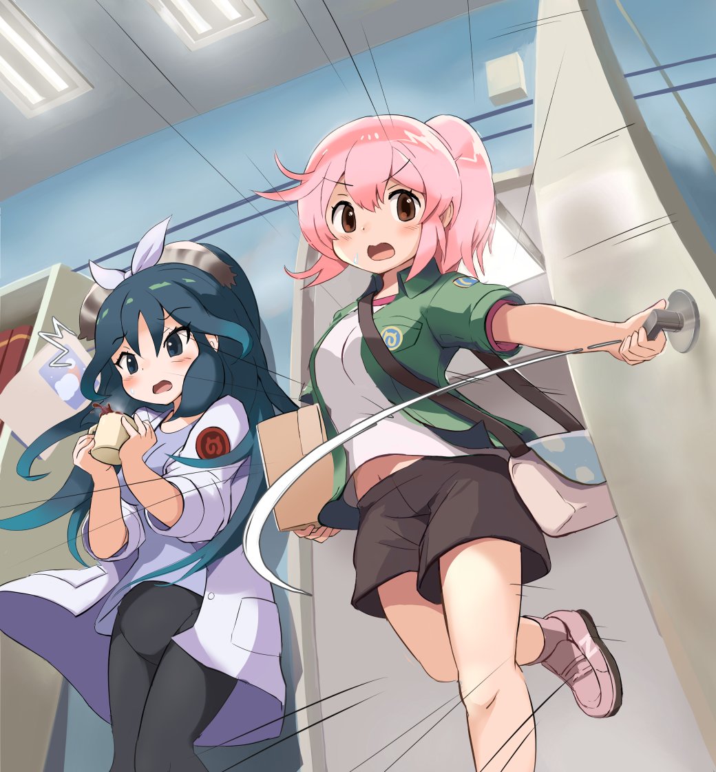 2girls bag black_pants blue_eyes blue_hair blush bow brown_eyes brown_shorts coat coffee_mug commentary_request cup green_jacket hair_bow jacket kako_(kemono_friends) kemono_friends kemono_friends_3 koutsuu_(koutuukanseikan) lab_coat long_hair messenger_bag midriff_peek mug multiple_girls nana_(kemono_friends) navel open_clothes open_jacket pants pink_hair pink_shoes shirt shoes short_hair short_shorts short_sleeves shorts shoulder_bag side_ponytail sneakers white_coat white_shirt