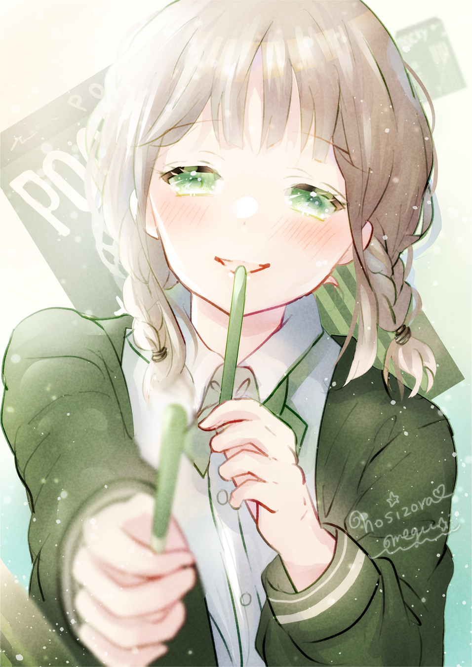 1girl artist_name blazer blunt_bangs blurry blush bow bowtie braid collared_shirt commentary depth_of_field far_(farstudio) food foreshortening giving gradient_background green_bow green_bowtie green_eyes green_jacket hair_tie heart highres holding holding_food jacket light_brown_hair long_sleeves looking_at_viewer low_twin_braids low_twintails medium_hair original pocky pocky_day romaji_text shirt smile solo star_(symbol) tongue tongue_out twin_braids twintails upper_body white_shirt