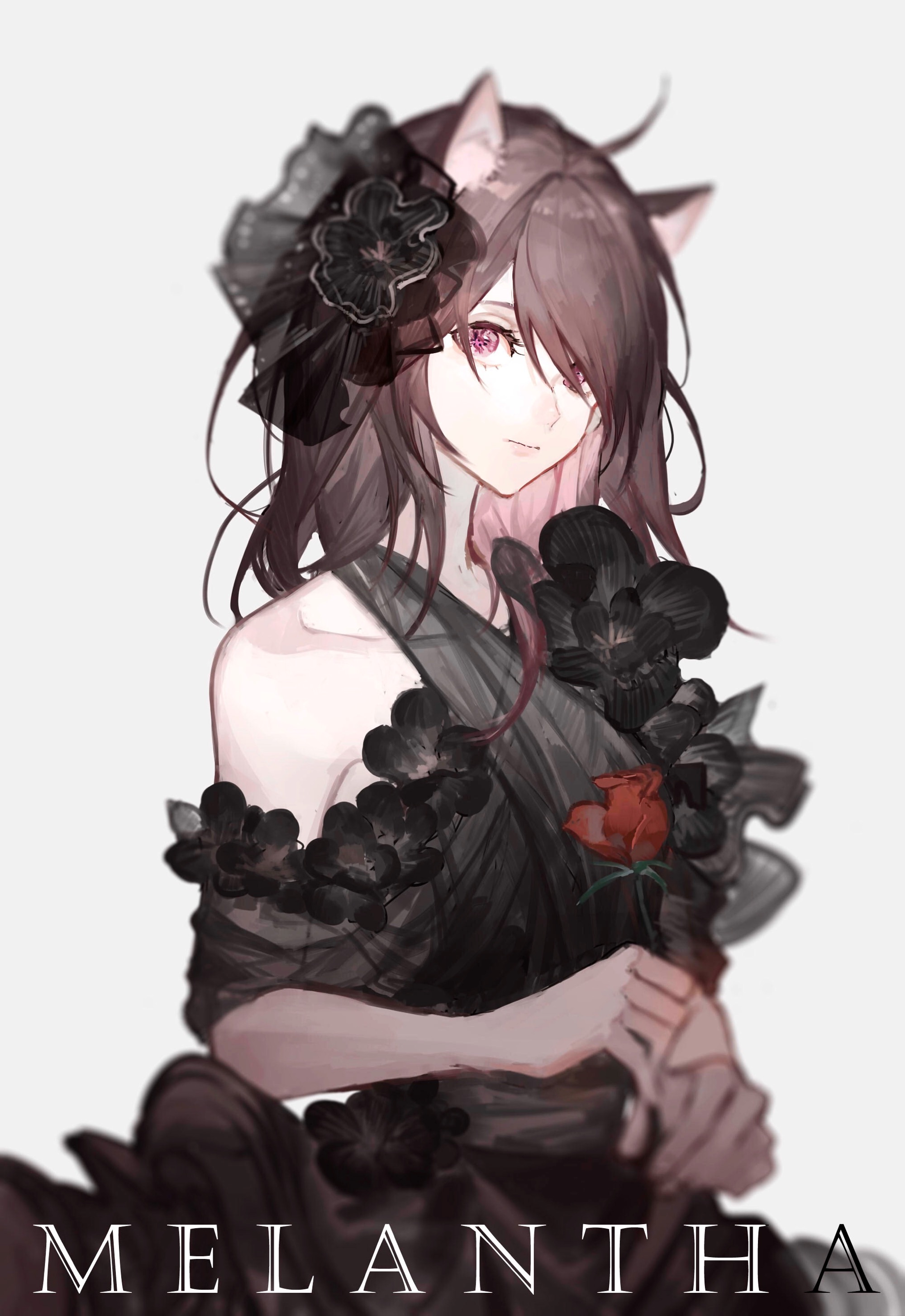 1girl absurdres ahoge alternate_costume animal_ear_fluff animal_ears arknights black_dress black_flower black_ribbon brown_hair cat_ears character_name chinese_commentary closed_mouth collarbone commentary dress flower gou_haihaihaihai grey_background hair_flower hair_ornament hair_over_one_eye hair_ribbon highres holding holding_flower looking_at_viewer melantha_(arknights) pink_eyes red_flower red_rose ribbon rose simple_background single_bare_shoulder solo upper_body