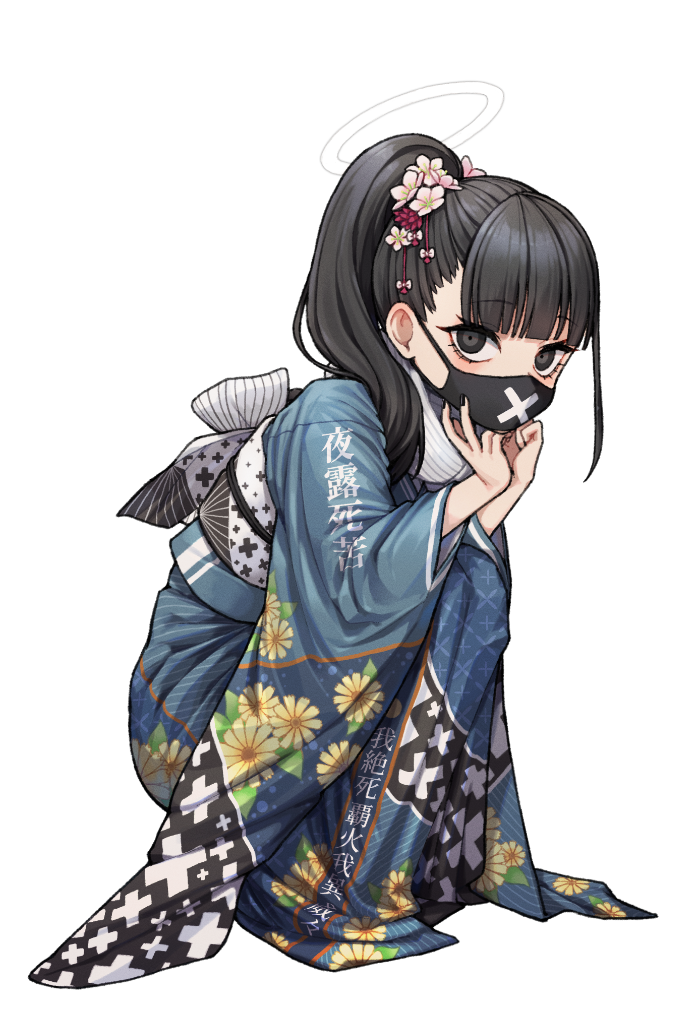1girl 28_(282teeth) bent_over black_hair blue_archive blue_kimono delinquent floral_print flower hair_flower hair_ornament halo highres japanese_clothes kimono looking_at_viewer mask ponytail sukeban sukeban_(smg)_(blue_archive)