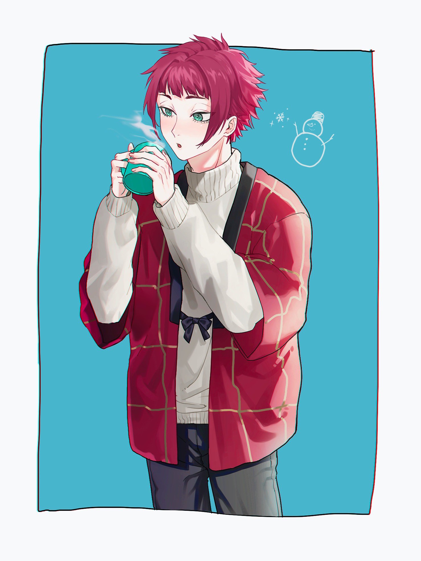 1boy alternate_costume bad_id bad_twitter_id black_pants blue_background blue_lock blue_tkse border commentary_request cowboy_shot cup green_eyes highres holding holding_cup itoshi_sae jacket long_sleeves male_focus mug open_mouth pants red_hair red_jacket short_hair simple_background solo standing steam sweater turtleneck turtleneck_sweater white_border white_sweater