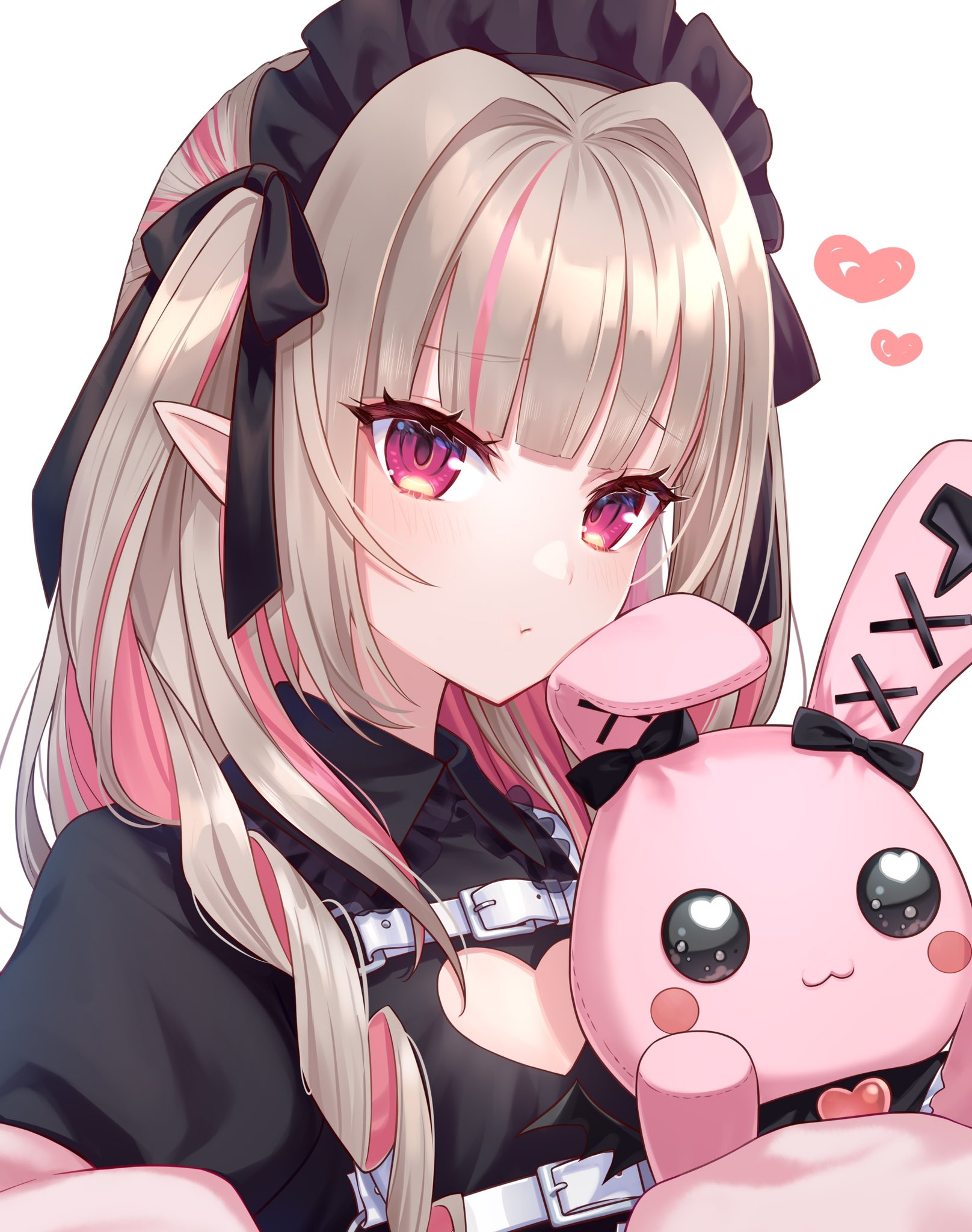 1girl black_dress black_headdress blush chest_harness clothing_cutout dress drill_hair flat_chest grey_hair harness heart heart_cutout highres holding holding_stuffed_toy jacket long_hair looking_at_viewer maid_headdress makaino_ririmu makaino_ririmu_(5th_costume) multicolored_hair nijisanji pink_hair pink_jacket pointy_ears pout red_eyes simple_background solo streaked_hair stuffed_animal stuffed_rabbit stuffed_toy two-tone_hair two_side_up upper_body virtual_youtuber white_background yamedaolol828