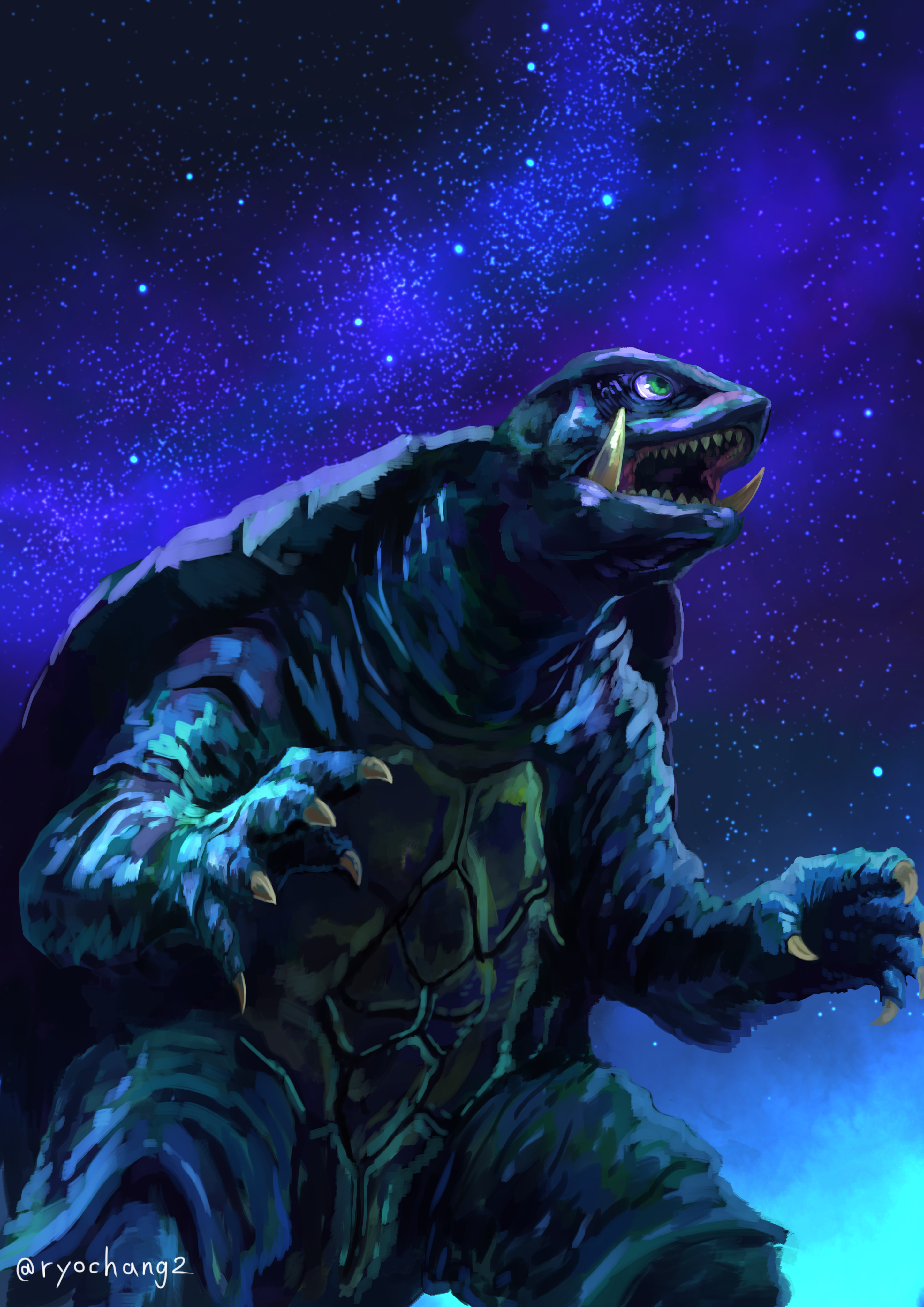 absurdres daiei_film gamera gamera:_guardian_of_the_universe gamera_(series) green_eyes highres kaiju night no_humans open_mouth ryochang sea_monster sky star_(sky) starry_sky turtle turtle_shell tusks