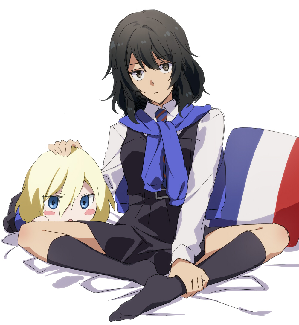 1girl amazuki_jou andou_(girls_und_panzer) bc_freedom_school_uniform black_dress black_hair black_socks blue_cardigan blue_necktie blush_stickers brown_eyes cardigan character_doll closed_mouth commentary dark-skinned_female dark_skin doll dress dress_shirt flag_print french_flag frown girls_und_panzer indian_style long_sleeves looking_at_viewer medium_hair messy_hair necktie on_bed oshida_(girls_und_panzer) pillow pinafore_dress pleated_dress print_pillow school_uniform shirt short_dress simple_background sitting sleeveless sleeveless_dress socks solo sweater_around_neck white_background white_shirt wing_collar