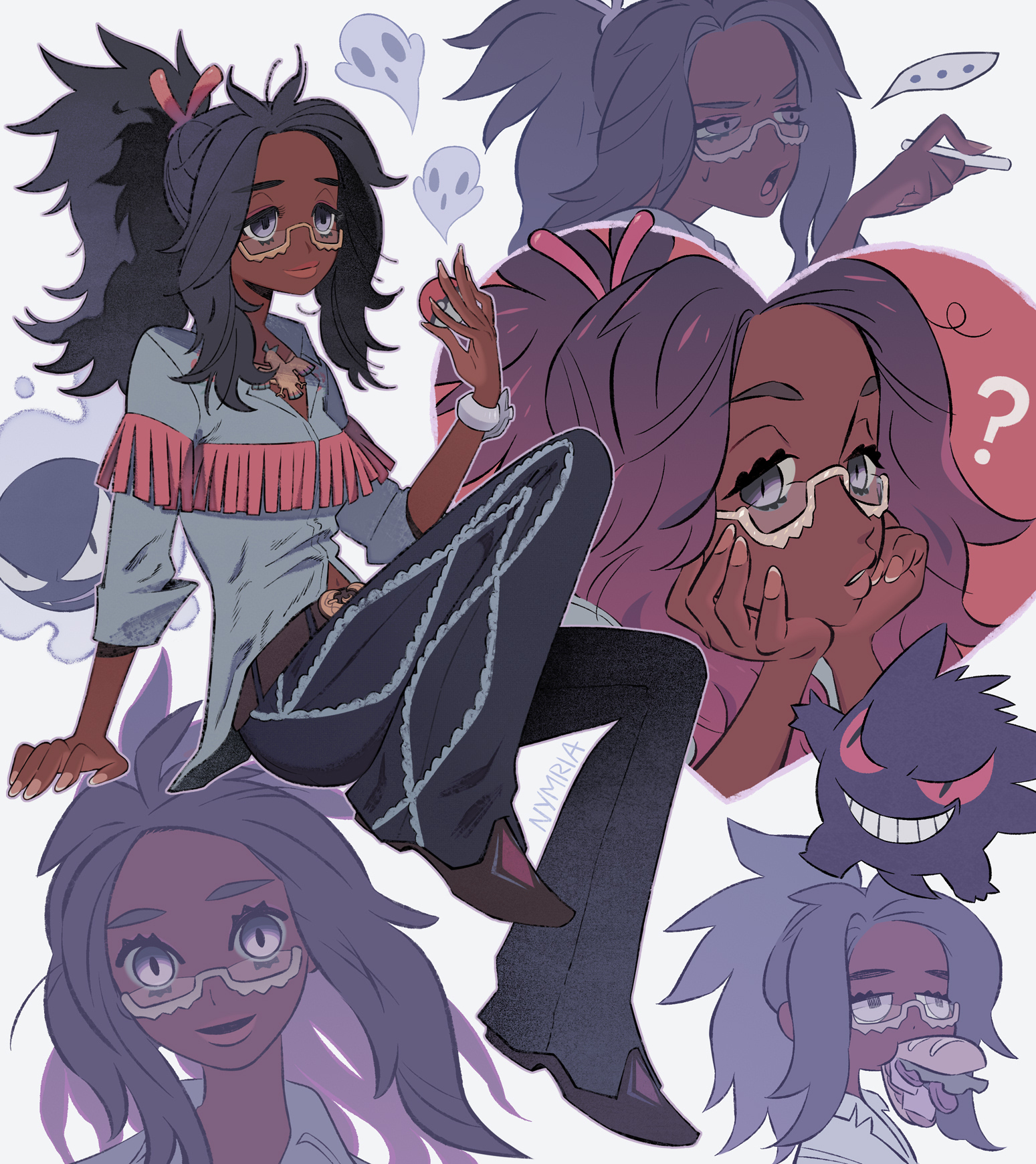... 1girl ? bell-bottoms belt black_hair brown_belt chalk collared_shirt dark-skinned_female dark_skin eating food fringe_trim full_body gastly gen_1_pokemon gengar glasses grey_eyes highres holding holding_chalk jewelry long_hair messy_hair multiple_views nintendo nymria pants pokemon pokemon_(creature) pokemon_scarlet_and_violet ponytail raifort_(pokemon) sandwich semi-rimless_eyewear shirt speech_bubble under-rim_eyewear