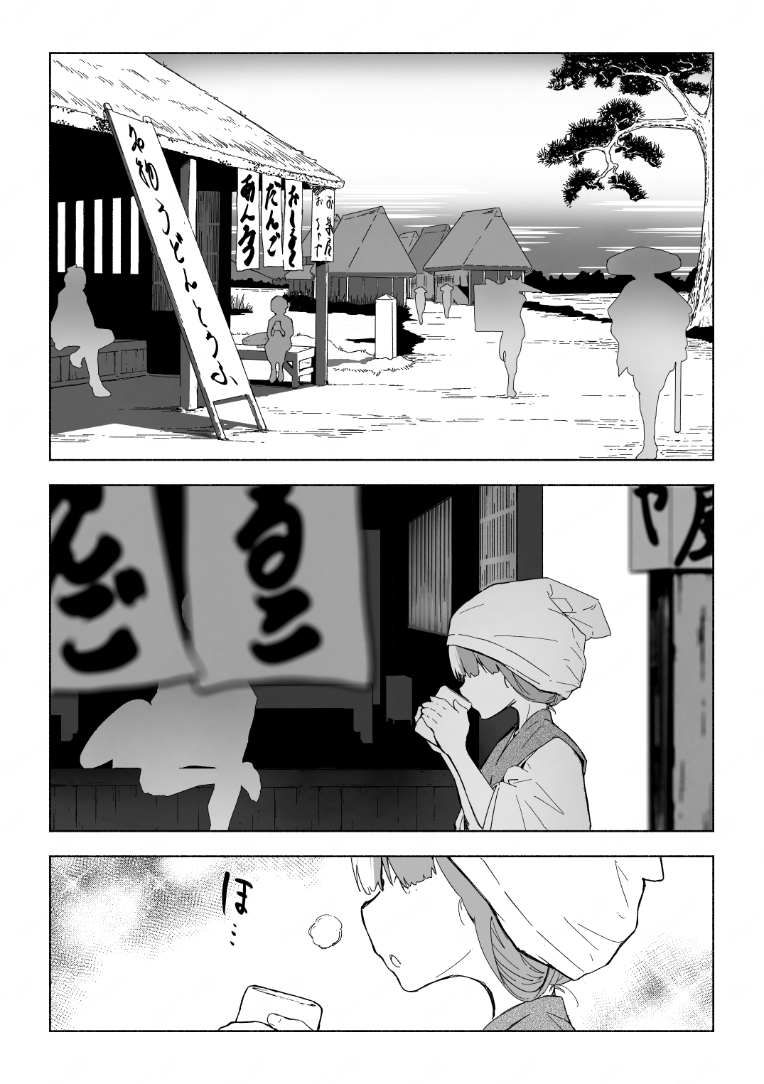 1girl akikawa_yayoi_(umamusume) breath comic drinking faceless glass goripan headscarf highres house japanese_clothes jidaigeki noren road rooftop sitting straw_(stalk) street tenugui tree umamusume vest
