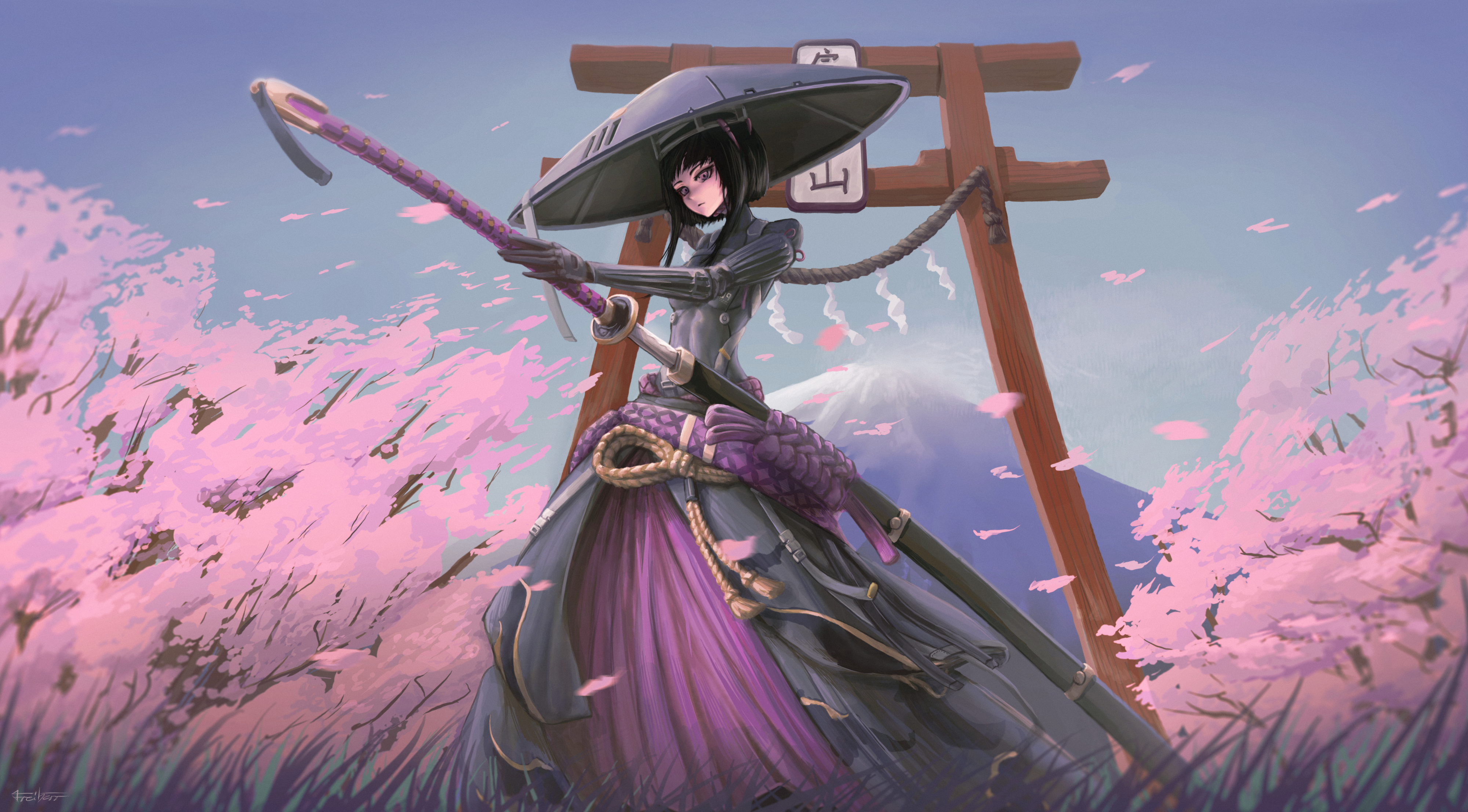 1girl absurdres black_hair borrowed_character cherry_blossoms closed_mouth cyborg falslander freiherr grass hat highres jingasa katana ootachi petals purple_eyes ronin_(neco) samurai scabbard science_fiction sheath short_hair solo standing sword torii tsurime weapon wind
