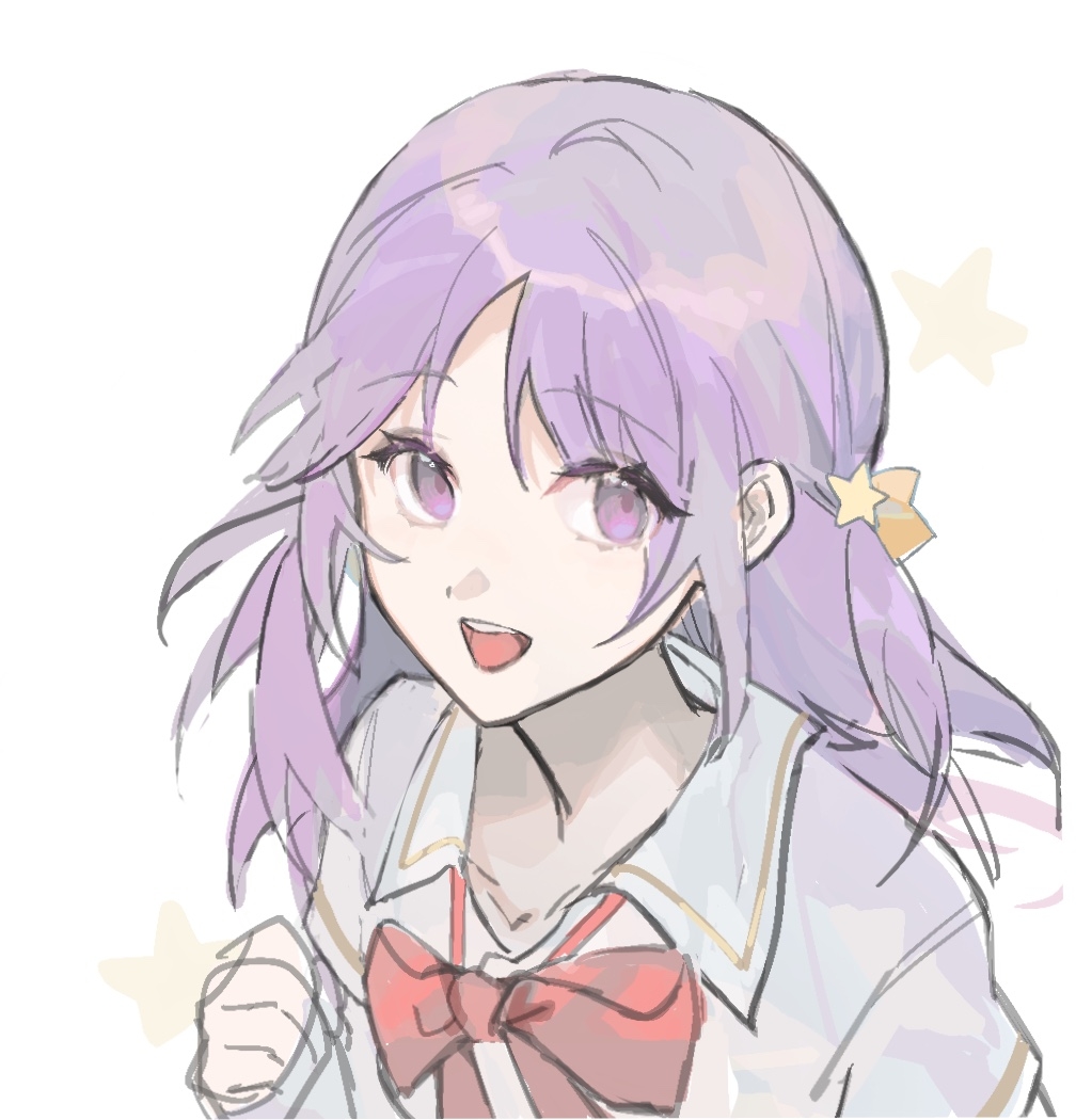 1girl :d blush bow bowtie hair_ornament hair_ribbon looking_at_viewer magia_record:_mahou_shoujo_madoka_magica_gaiden mahou_shoujo_madoka_magica misono_karin open_mouth orange_ribbon purple_eyes purple_hair red_bow red_bowtie ribbon sakae_general_school_uniform school_uniform shirt simple_background smile solo star_(symbol) star_hair_ornament tsukinaga1028 upper_body white_background white_shirt wing_collar