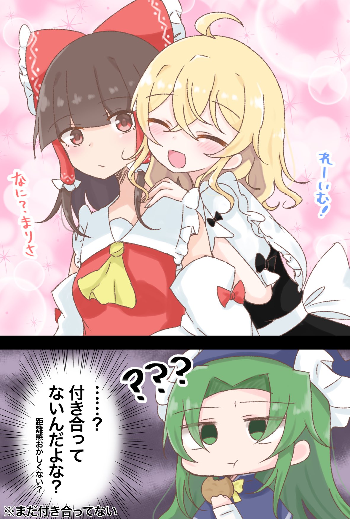 2koma 3girls :t ? ?? ahoge ascot back_bow black_bow blonde_hair blue_capelet blunt_bangs bow brown_eyes capelet check_translation closed_eyes collared_shirt comic commentary_request crossed_bangs detached_sleeves eating emphasis_lines frilled_bow frills green_eyes green_hair hair_bow hair_tubes hakurei_reimu heart heart_background highres kirisame_marisa long_hair mima_(touhou) multiple_girls pink_background red_bow red_eyes red_vest shirt sidelocks sleeveless sleeveless_shirt touhou translation_request vest white_bow white_shirt white_sleeves yamutarou yellow_ascot yellow_bow