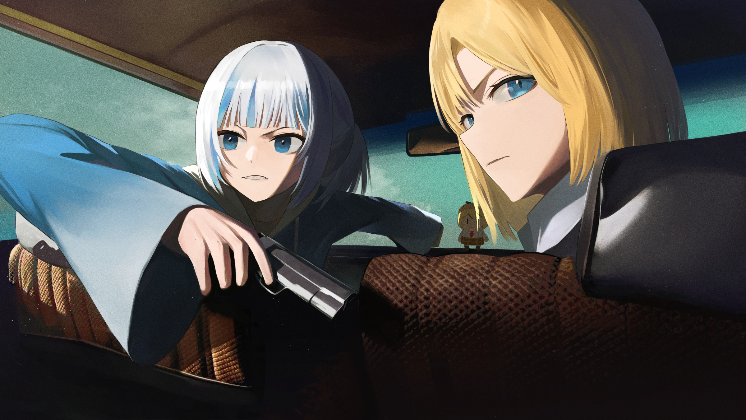 >:( 2girls angry blonde_hair blue_eyes blue_hair blue_hoodie bob_cut breaking_bad car car_interior collared_shirt commentary gawr_gura grey_hair gun highres holding holding_gun holding_weapon hololive hololive_english hood hoodie long_sleeves looking_back motor_vehicle multicolored_hair multiple_girls on_car parody scene_reference seistfu sharp_teeth shirt short_hair sitting smol_ame streaked_hair teeth v-shaped_eyebrows virtual_youtuber watson_amelia weapon white_shirt wide_sleeves