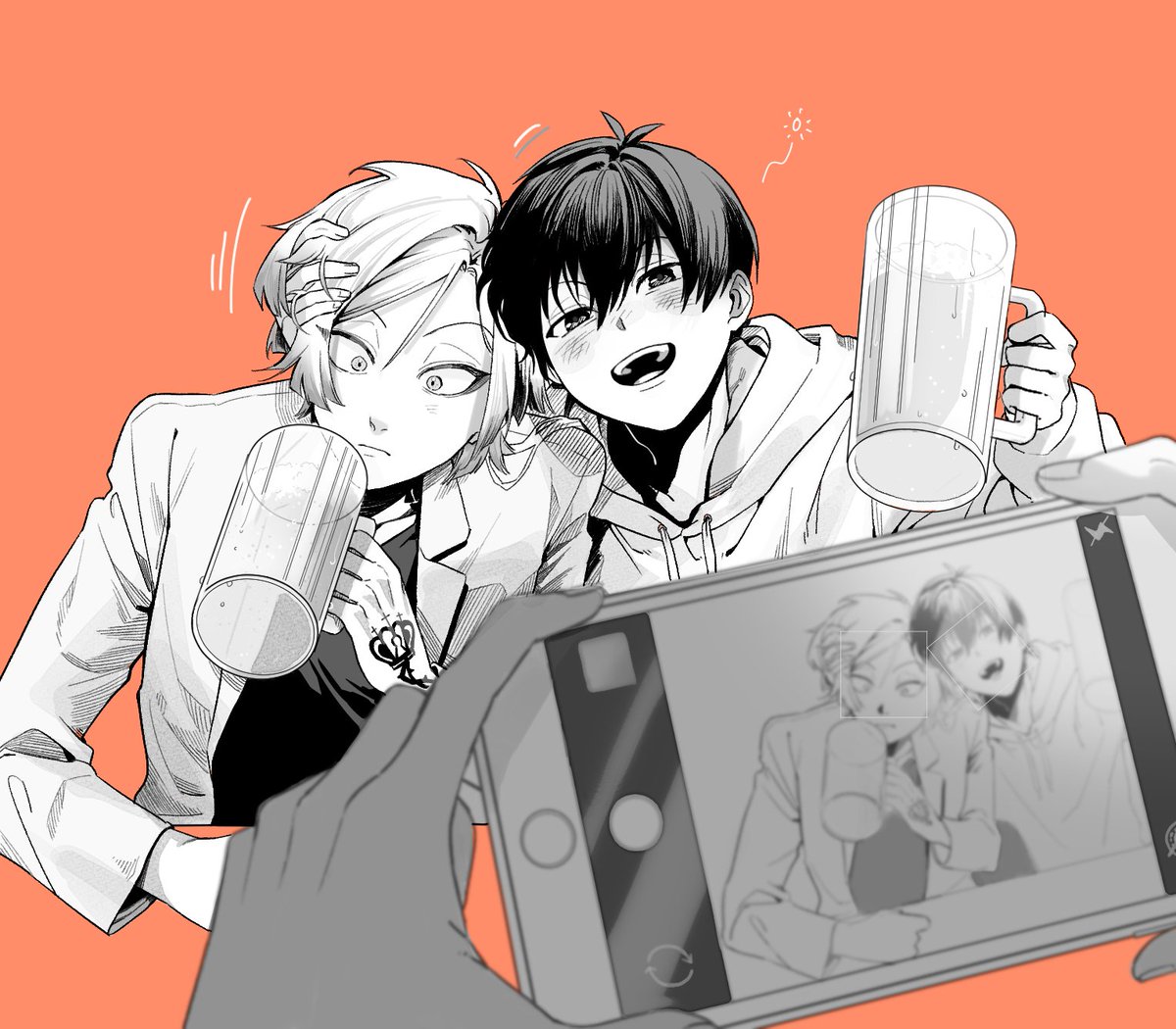 2boys alcohol beer beer_mug blue_lock blue_tkse blurry blurry_foreground blush cellphone closed_mouth commentary_request cropped_torso cup drunk greyscale_with_colored_background hand_on_another's_head holding holding_cup holding_phone hood hood_down hoodie isagi_yoichi jacket long_sleeves looking_at_viewer male_focus michael_kaiser monochrome mug multiple_boys open_mouth orange_background out_of_frame phone shirt short_hair simple_background smartphone smile squeans taking_picture upper_body