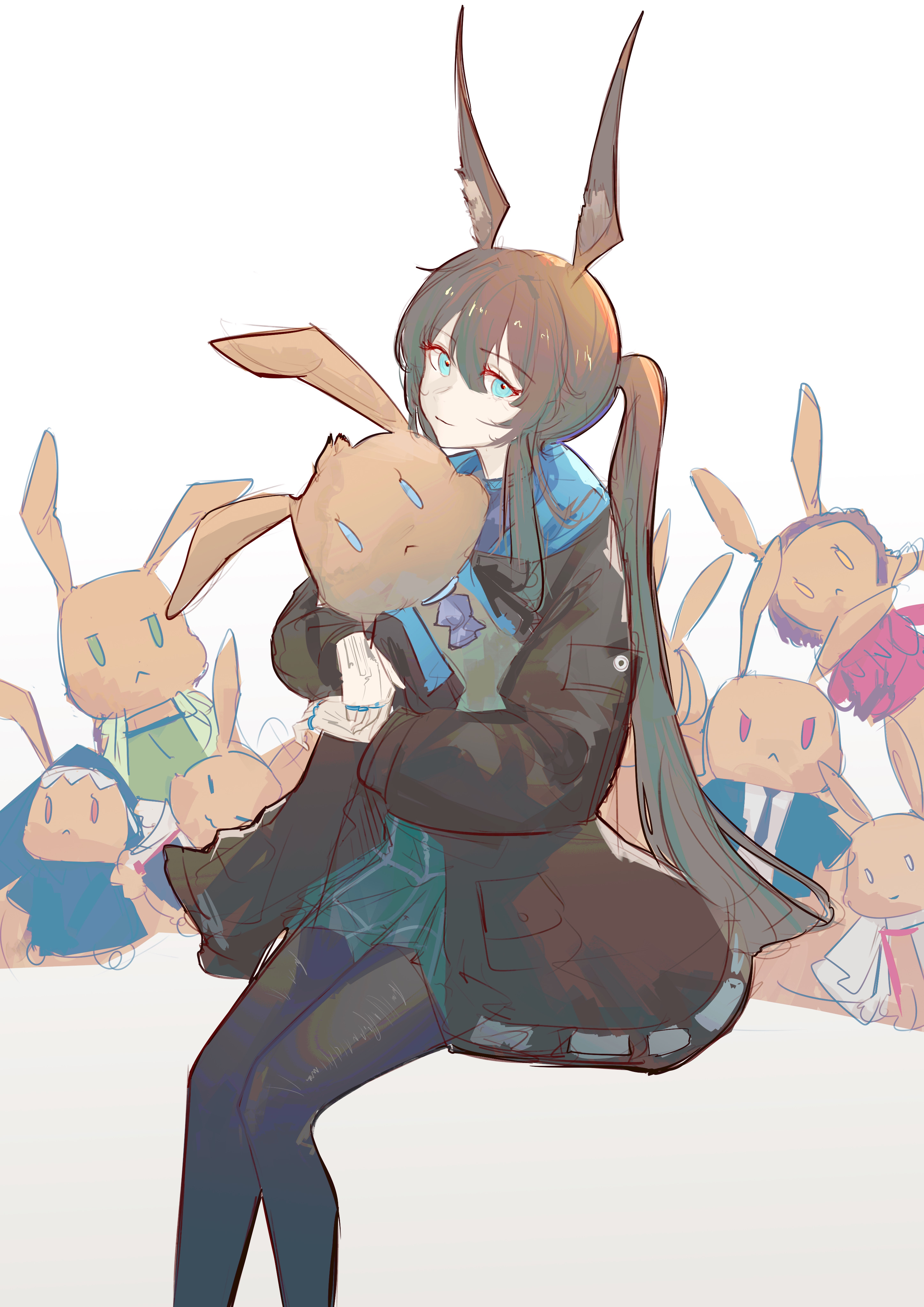 1girl absurdres amiya_(arknights) animal_ear_fluff animal_ears arknights black_jacket black_pantyhose blue_skirt brown_hair closed_mouth commentary feet_out_of_frame grey_background hair_between_eyes highres jacket long_hair long_sleeves looking_at_viewer naoel_(naoel_art) hugging_object open_clothes open_jacket pantyhose ponytail puffy_long_sleeves puffy_sleeves rabbit_ears sidelocks sitting sketch skirt sleeves_past_wrists solo stuffed_animal stuffed_rabbit stuffed_toy very_long_hair white_background