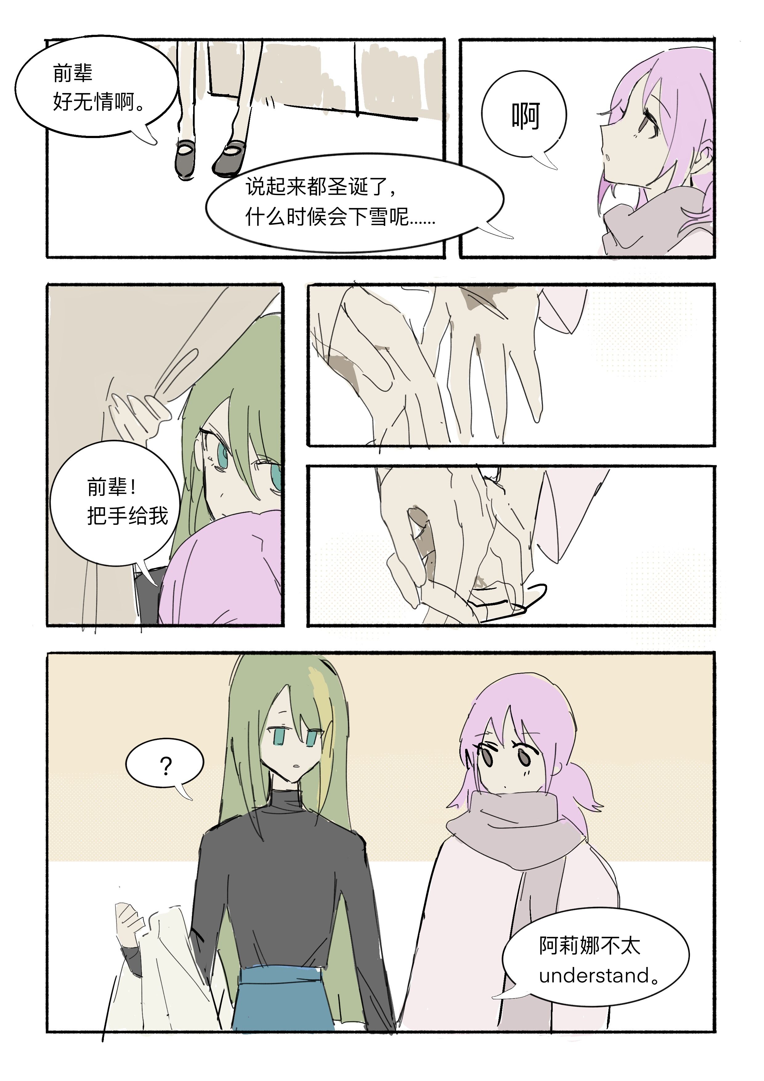 2girls absurdres alina_gray alternate_costume chinese_text comic green_eyes green_hair hair_between_eyes highres holding_hands long_hair long_sleeves magia_record:_mahou_shoujo_madoka_magica_gaiden mahou_shoujo_madoka_magica misono_karin multiple_girls purple_hair scarf speech_bubble sweater translation_request tsukinaga1028