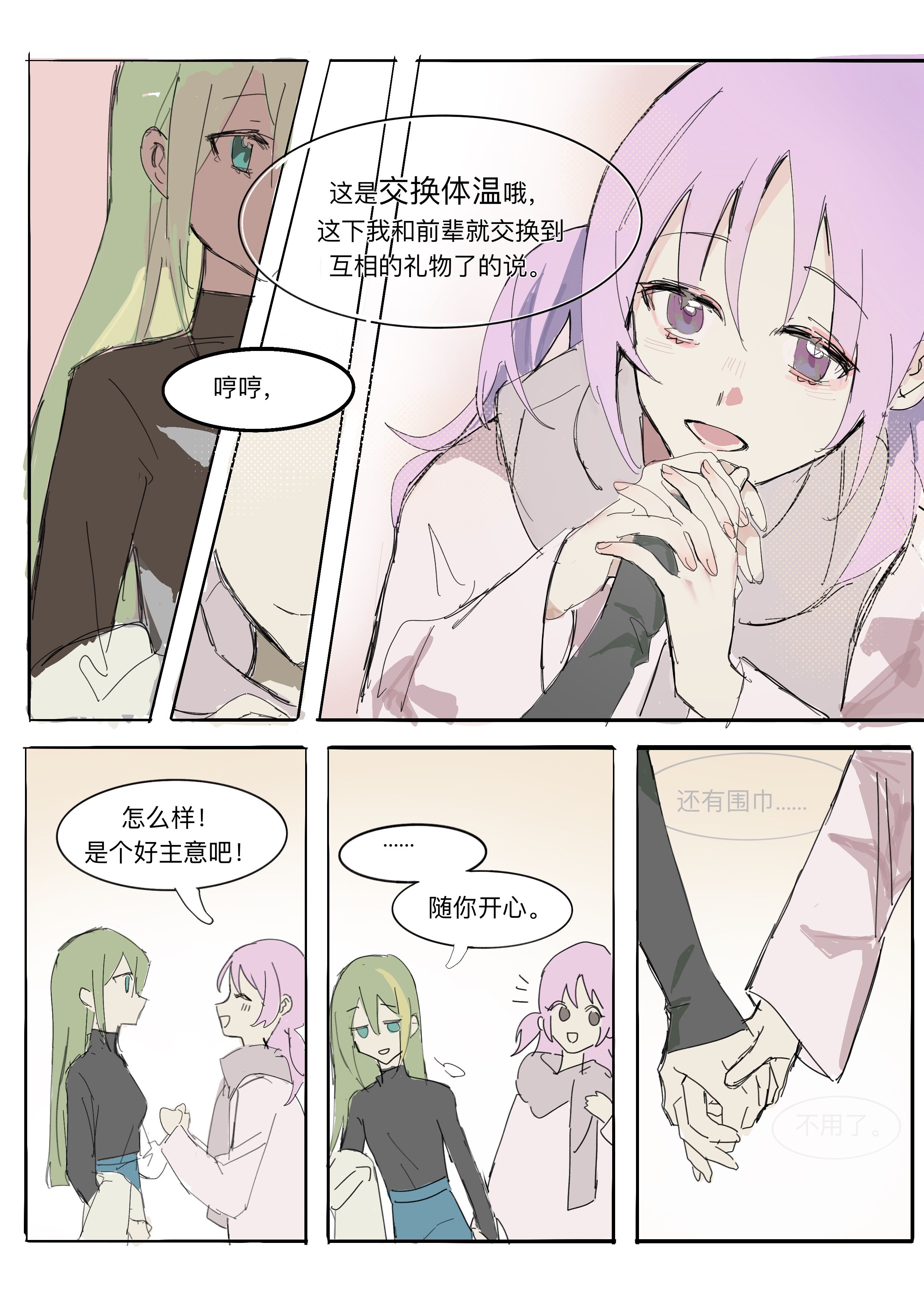 2girls absurdres alina_gray alternate_costume blonde_hair chinese_text comic green_eyes green_hair highres holding_hands long_hair long_sleeves magia_record:_mahou_shoujo_madoka_magica_gaiden mahou_shoujo_madoka_magica misono_karin multiple_girls open_mouth pink_hair purple_eyes scarf smile speech_bubble translation_request tsukinaga1028